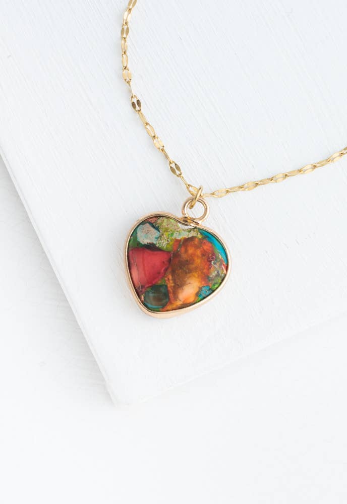 Our Love in Bloom Necklace features a vibrant jasper stone wrapped in a 14K gold plated heart setting on an adjustable chain. May the rainbow of marbling within the jasper stone...