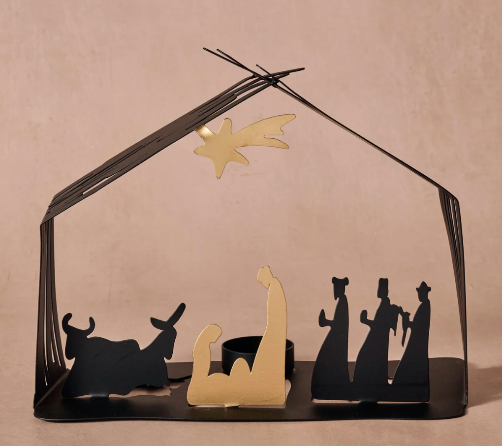 Bring the story of Christmas to life with this striking creche. Expertly crafted from a single piece of iron, this silhouette-style scene is a modern take on a timeless tradition. The stable structure is formed by bending the sides and roof at clean angles, with overlapping points soldered for strength and elegance. Figures of the Holy Family, wise men and animals are intricately cut and bent outward, creating a dimensional tableau. A radiant gold star shines above, while the Holy Family is highlighted in a golden finish creating a beautiful contrast to the creche’s matte black backdrop. A bold yet reverent piece, perfect for minimalist holiday décor. A Ten Thousand Villages Exclusive handcrafted in India.