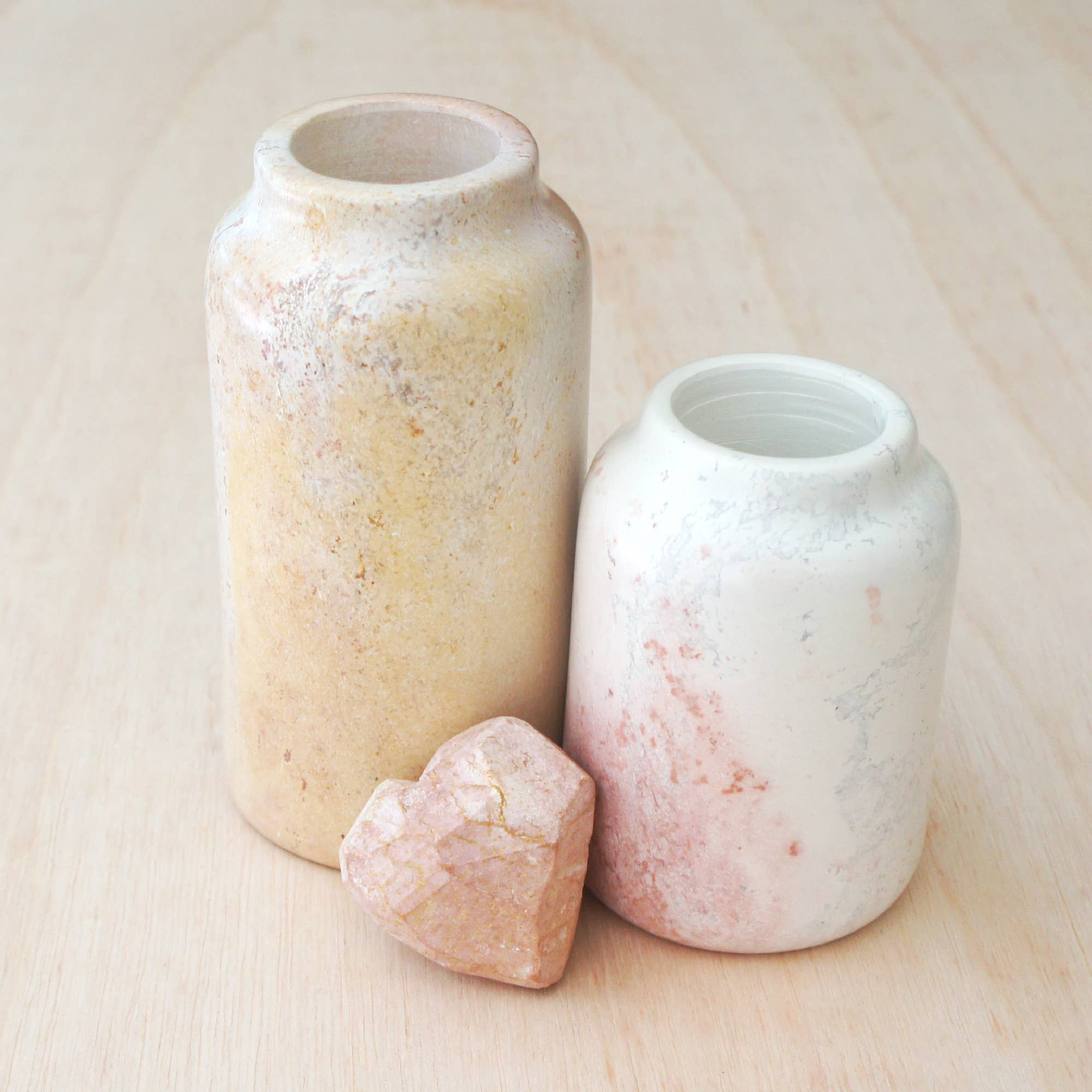 These natural candleholder vases are a fair trade product handmade in Kenya. They are hand carved out of stone and then sanded until smooth. These feature an inner ledge to hold standard taper candles (the opening is approximately ⅞ inches wide). If the taper candle fit is too snug, try trimming up to 1 inch off the bottom of the candle for a better fit. These are also designed to hold flowers as the center hole drops down within 1 inch of the base. For decorative use only with dried flowers or botanicals; not intended to hold water. Since these vases show the natural colors of the stone, some color variations should be expected. One can often see shades of cream, gray, pink, and brown in the vases. Sold individually. All vases are approximately 2 inches wide. The medium vase stands 5.5 inches tall.
