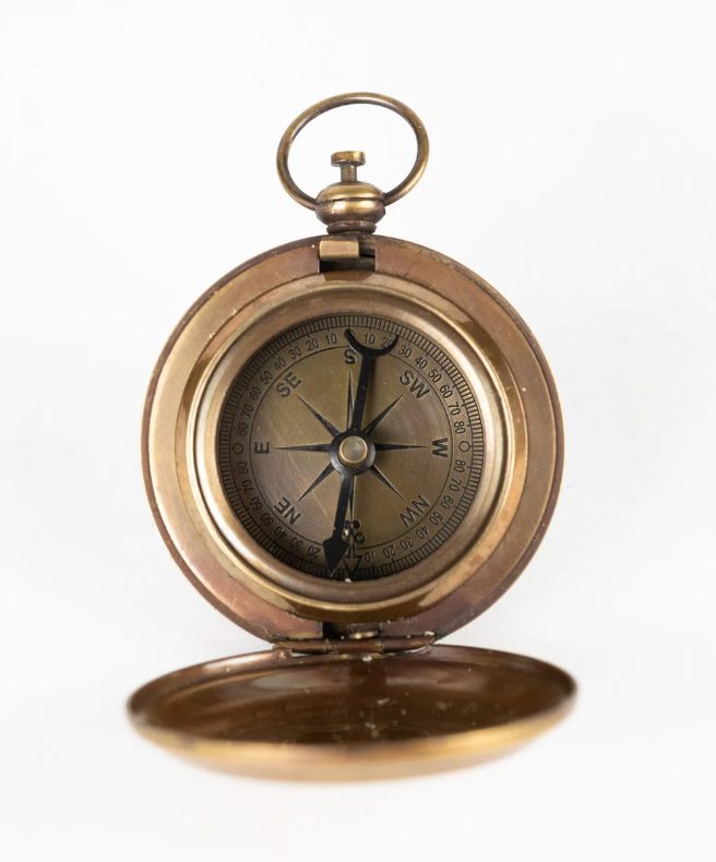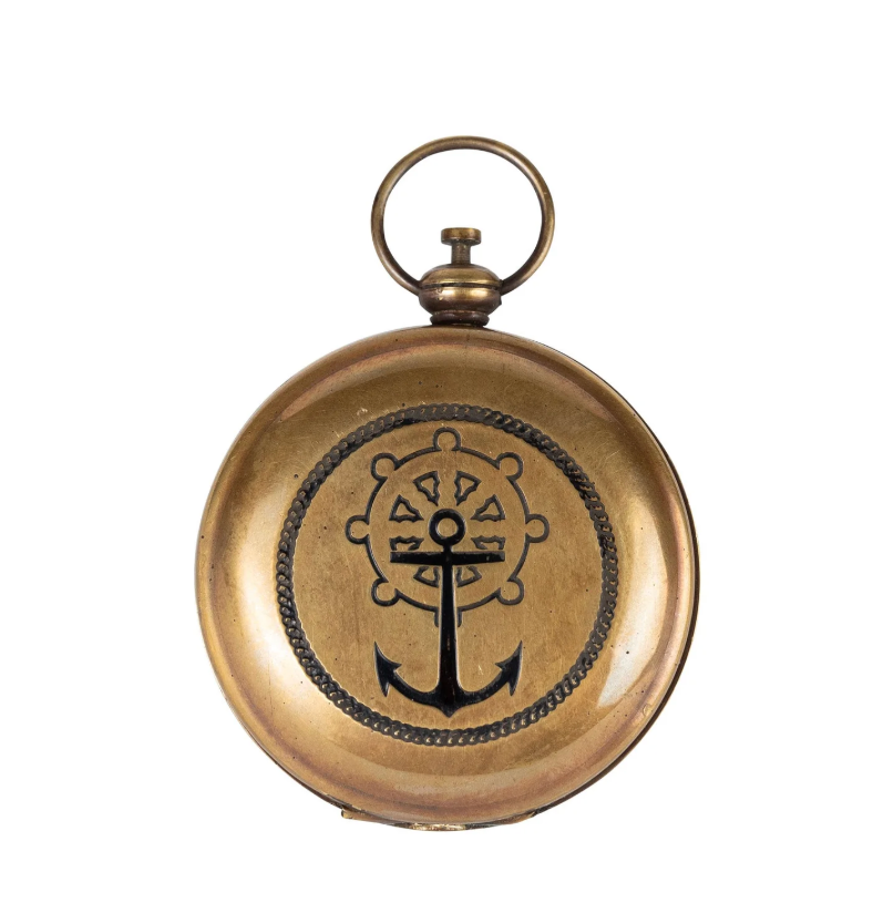 The Voyager's Pocket Compass is made of brass with a glass cover over the compass face. It employs a hinged cover that when opened by pressing the release button, reveals a compass inside. The cover features an etched anchor and nautical design sure to delight any sailor (or hopeful sailor).