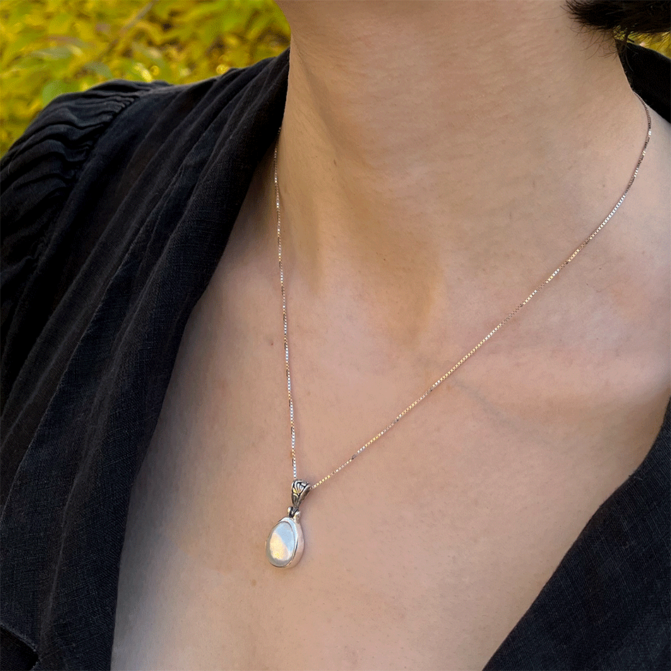 PlThis stunning necklace is handmade by talented artisans in Bali. It features a fresh water pearl encased in brass with an intricate filigree brass bale. This elegant piece looks great alone...