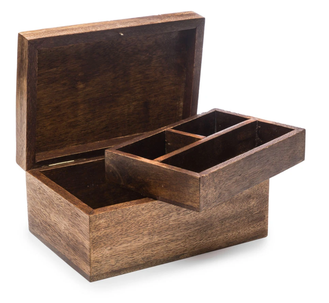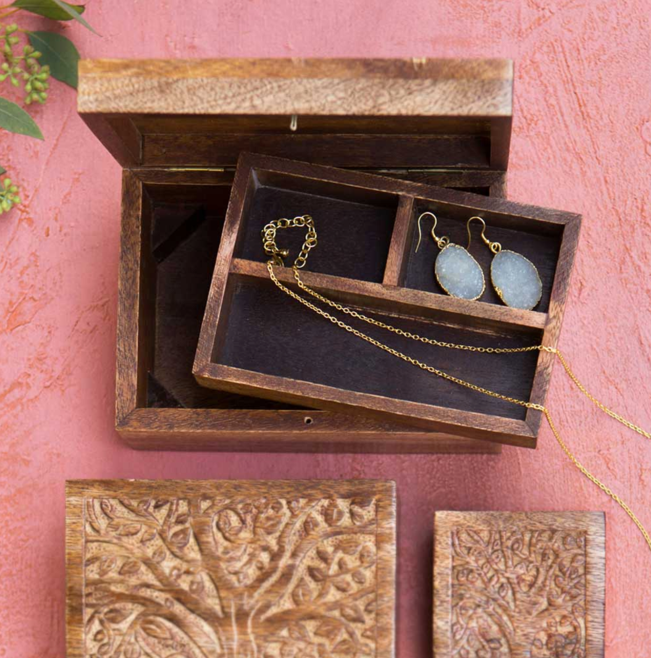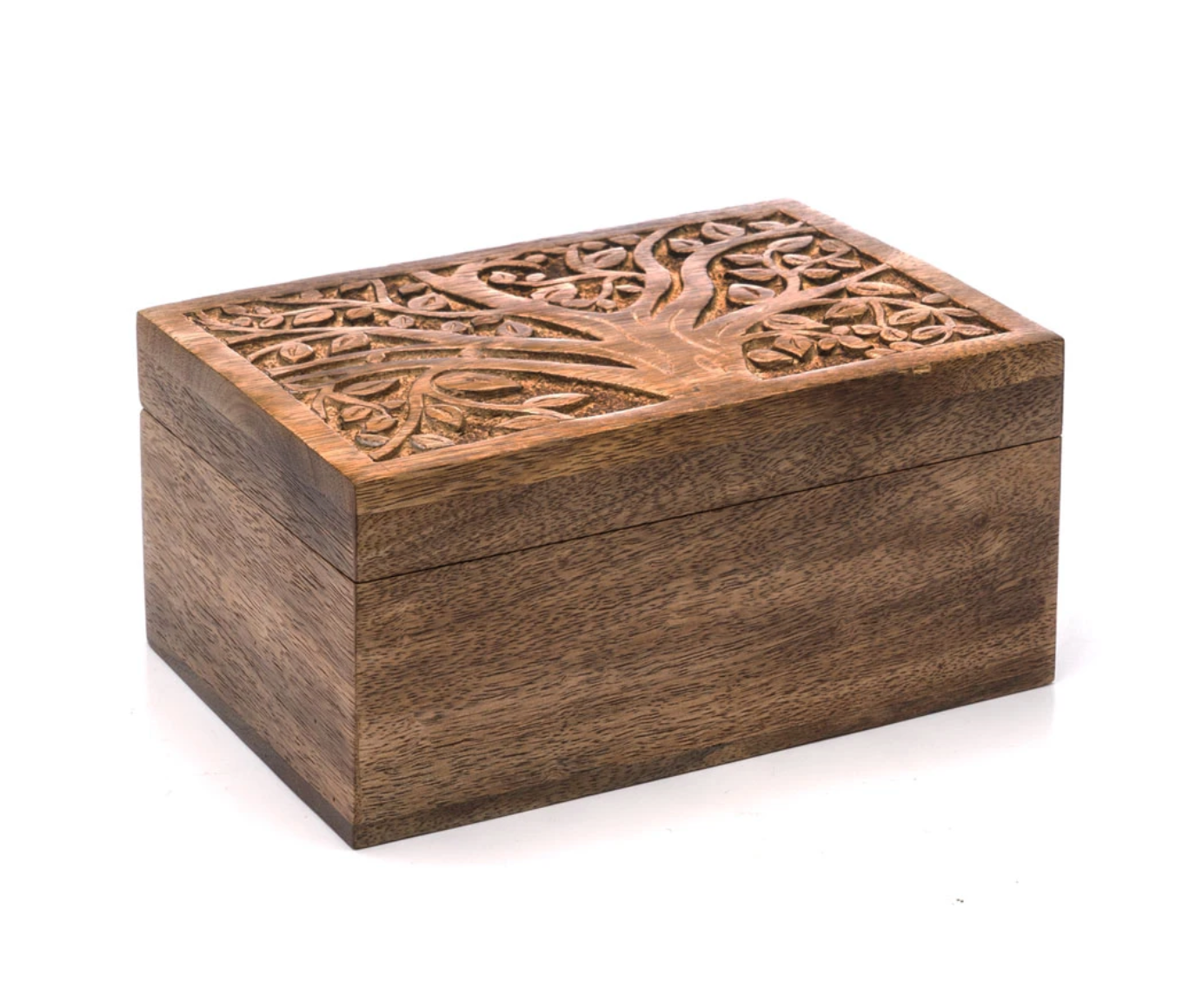 Ethically sourced mango wood box with removable storage tray and hand carved tree of life design honoring Forest Goddess Aranyani.