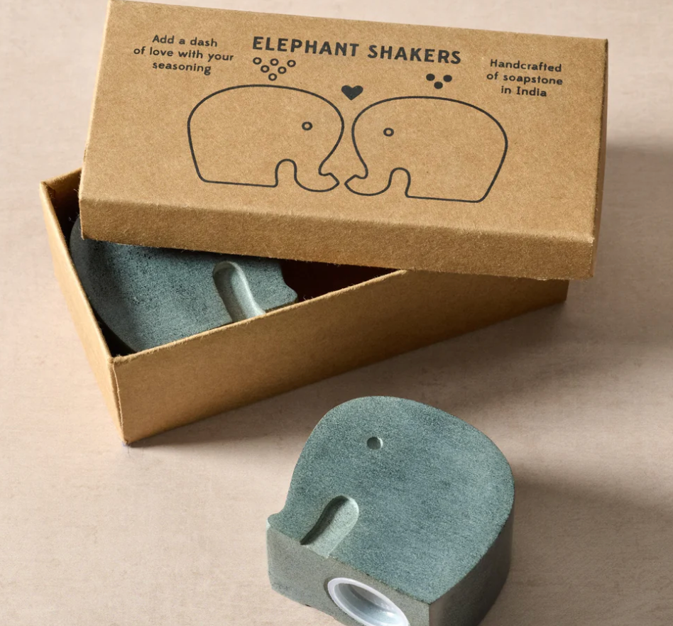 Shake things up with this adorable elephant salt and pepper set! Handmade from Palewa stone, these shakers are beautifully carved and add a touch of functional art to your table. Complete with a charmingly adorned gift box! A Ten Thousand Villages Exclusive handcrafted in India by our fair trade partner Tara Projects, which helps transform artisans' lives and communities with new opportunities to earn sustainable income.