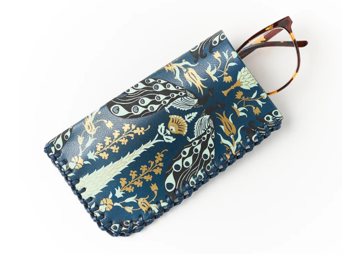 Our handcrafted leather Fauna Collection showcases traditional techniques in Indian leather craft, combining ethically sourced, eco conscious vegetable tanning, cruelty-free leather and screen printed, flora and fauna inspired designs with metallic accents. This unique, soft leather glasses case features an enchanting peacock design with metallic accents and blanket stitch detail. The cultural arts of leather craft and leather tooling have been passed down for generations in Rajasthan, India. Intricate design detail and rich color pallet express age-old Indian motifs.