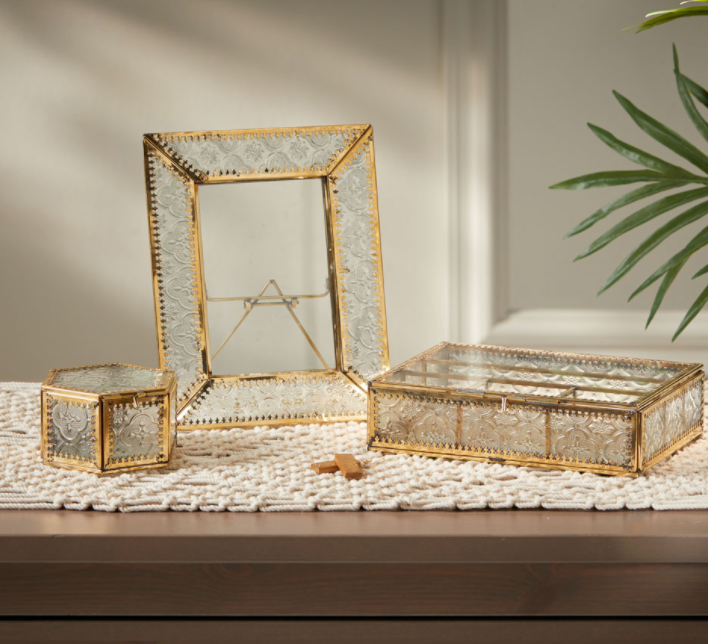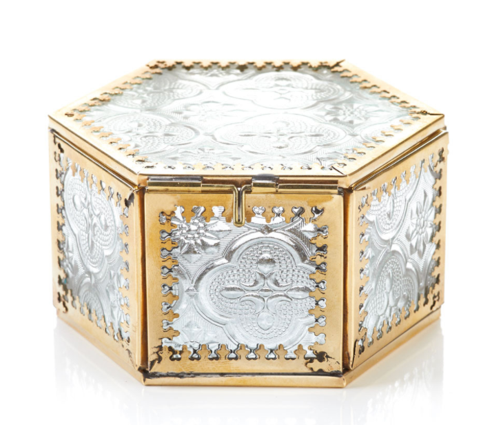 This glass and brass keepsake box is etched with a quatrefoil pattern, giving it an elegant appearance. This hexagon-shaped box opens easily from the top and secures with sliding pin. Dimensions: 2 1/2"h x 4 1/4"dia.