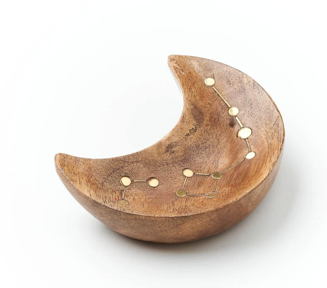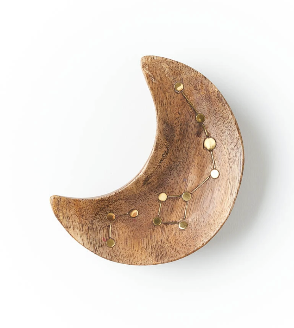 Ethically handcrafted from sustainably harvested mango wood in north central India, our Jyotisha Collection features a beautiful, brass inlaid constellation design. With its unique crescent shaped design, this attractive catch all...
