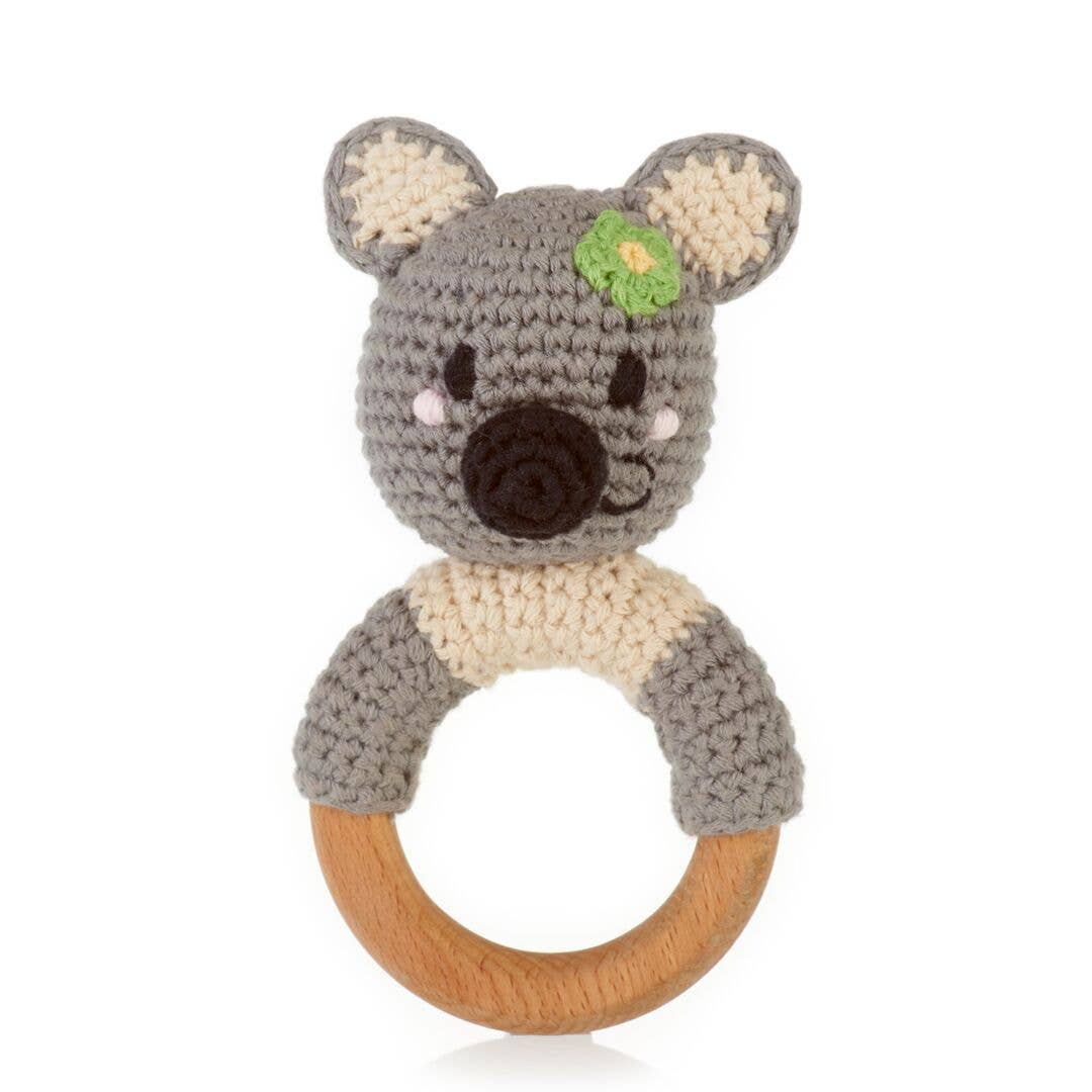 Featuring our gentle koala bear and a teething ring made of beech wood, this handmade rattle is as colorful as it is playful. Give it a shake for a gentle jingle....