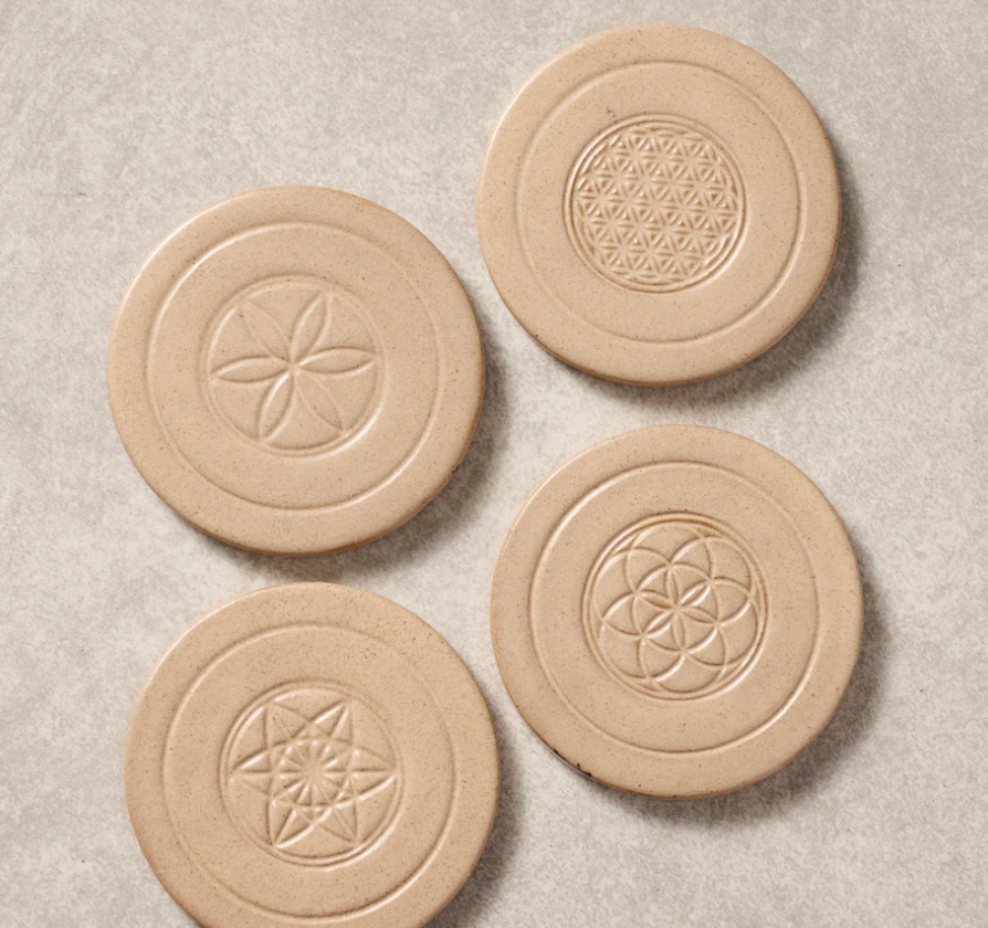Embrace peace and balance with these awesome coasters. This set includes four unique designs: Germ of Life, Seed of Life, Flower of Life and Equilibrium of Life. Each coaster comes with felt feet to protect surfaces and is beautifully tied together with natural jute string. Perfect for gifting or adding a touch of spirituality to your own living space. Includes a card that explains each of the symbols. A Ten Thousand Villages Exclusive handcrafted in Nepal.