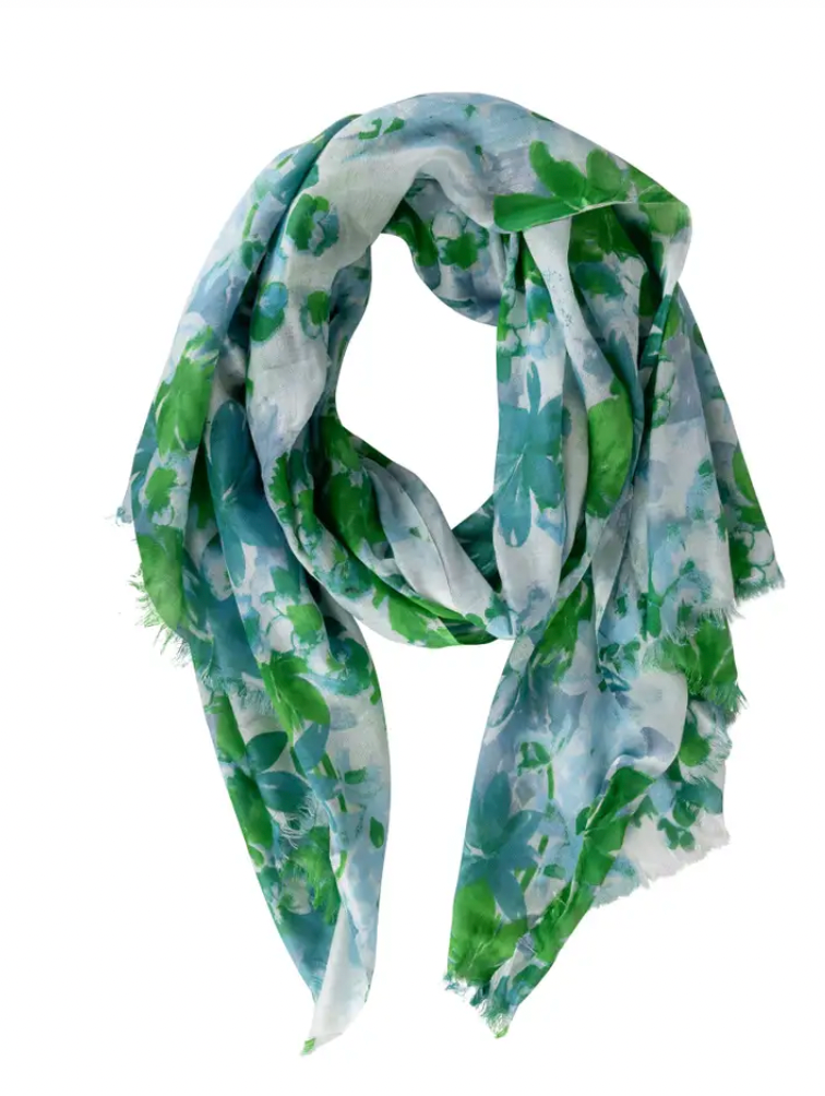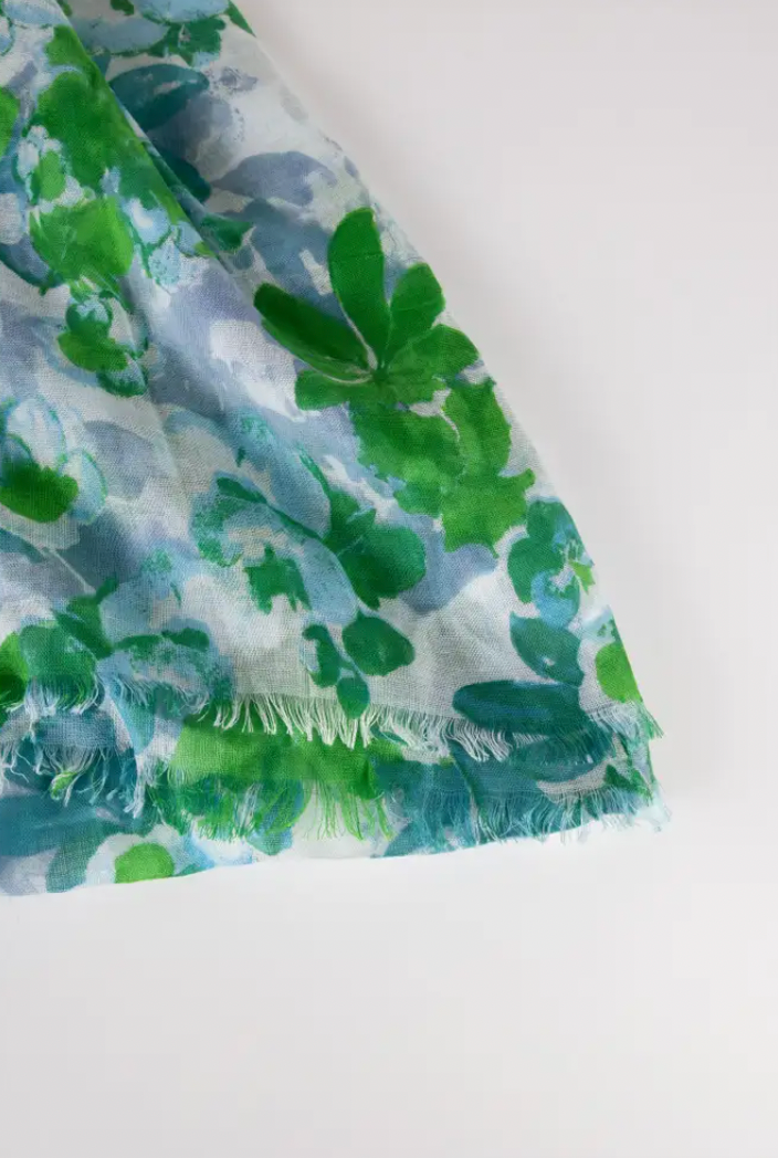 Just in time for that spring wardrobe transition! This viscose scarf is so lightweight it's slightly translucent. The Watercolor Gardens Scarf features a white base with a large green and light blue floral design. The scarf has finished edges on the long sides and unfinished, fringed edges on the ends. Perfect for those chilly mornings that give way to warm afternoons.