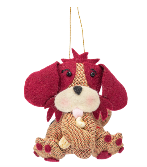 How about this friendly pup with his bone? This adorable dog is from our newest series of animal ornaments. Featuring a little dog crafted from traditional Guatemalan fabric, holding a tasty Christmas bone. Fuzzy felt accents, bead eyes and realistic bone. There's also an elastic on the back of the pup so he doubles as a fun puppet! Includes a gold hanging cord. Handcrafted in Guatemala by UPAVIM Crafts and Fair Trade!