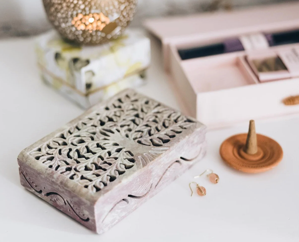 This captivating box hand-carved from gorara stone is crafted by artisans working with Asha Handicrafts. Meaning "hope" in Sanskrit, Asha Handicrafts is an Indian fair trade organization that has been working to promote the social and economic development of artisans throughout India for more than 40 years. Asha works with more than 50 producer groups and more than 1,200 makers across India, ensuring that men and women working in this traditional craft receive equal pay for equal work.
