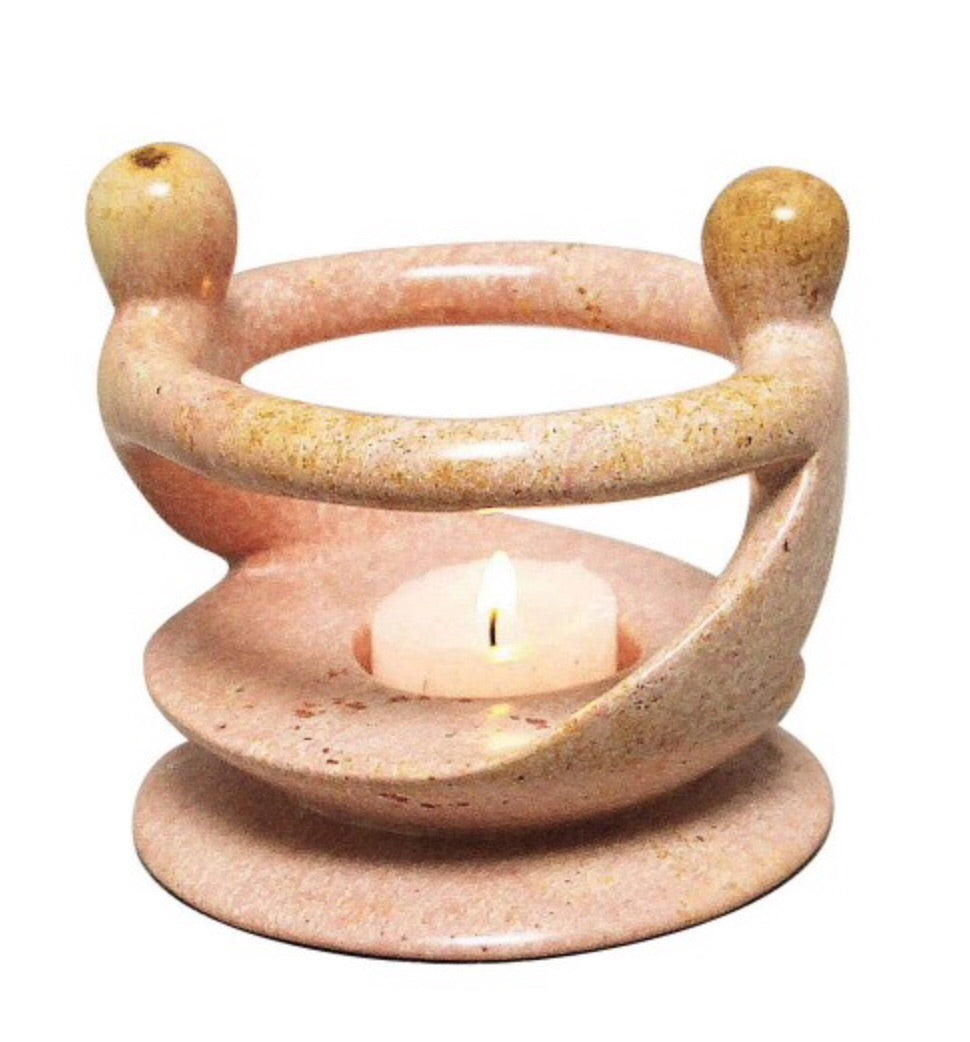 In a graceful dance of light and union, harmonious figures swing around tea light candleholder. Kisii stone is a type of soapstone found only in a small area of western Kenya near the town of Kisii. The two figures in the round depicted in this carving symbolize balance and well-being in relationship: the circle of life is complete when grounded in light.
