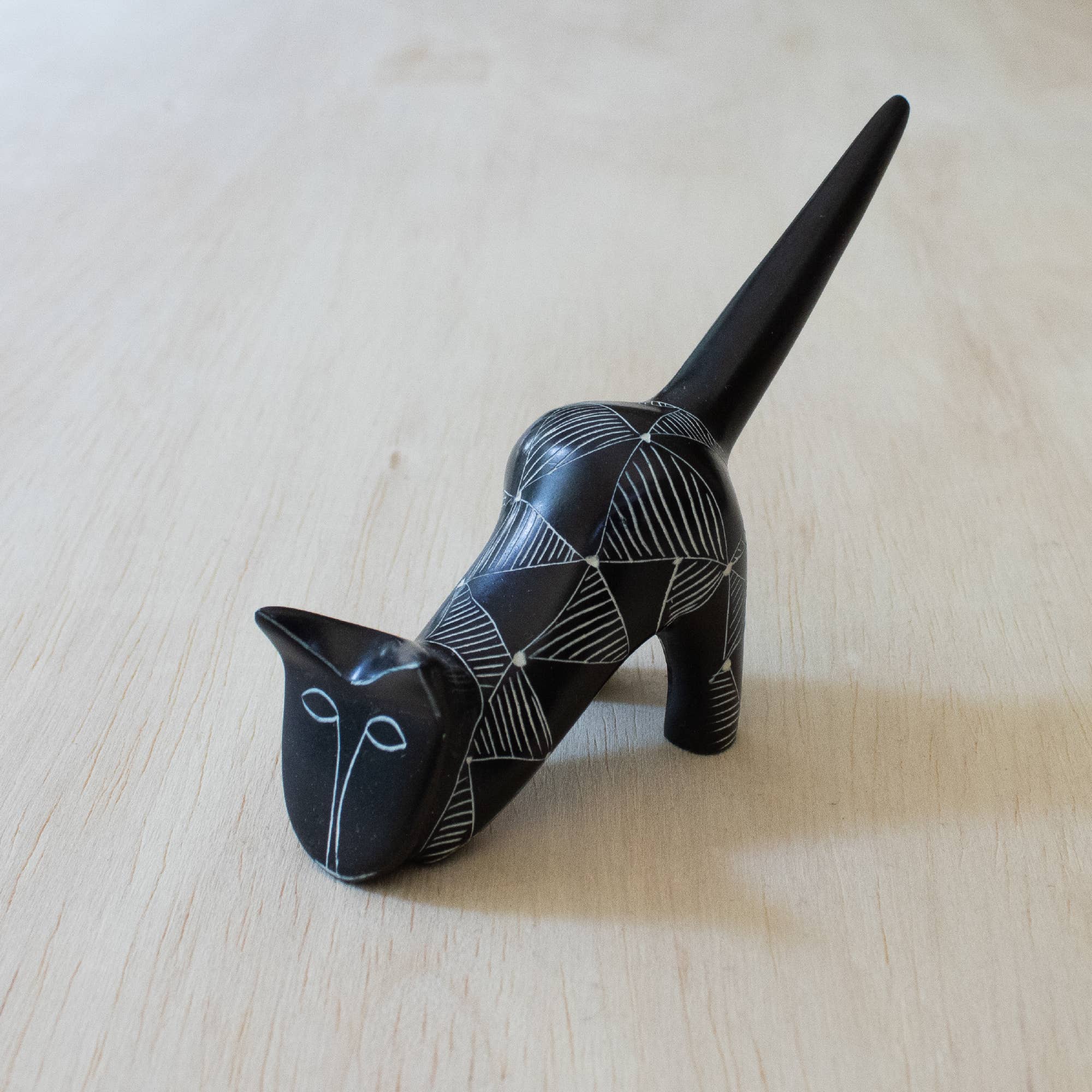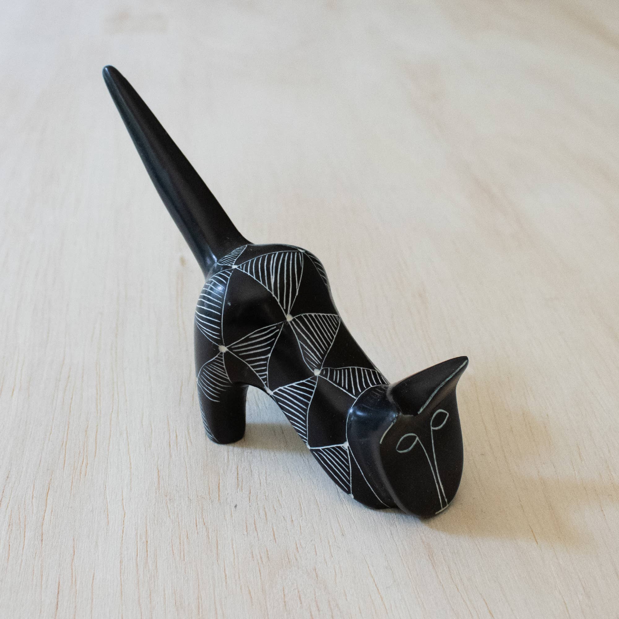 This pouncing and playful cat is a fair trade product handmade in Kenya. It is hand carved out of stone, sanded until smooth, and dyed. Then an artisan uses a knife to etch the patterns into each cat. The unique tail design makes these great ring holders. Approximately 4 inches long and 2.5 inches tall. Sold individually.