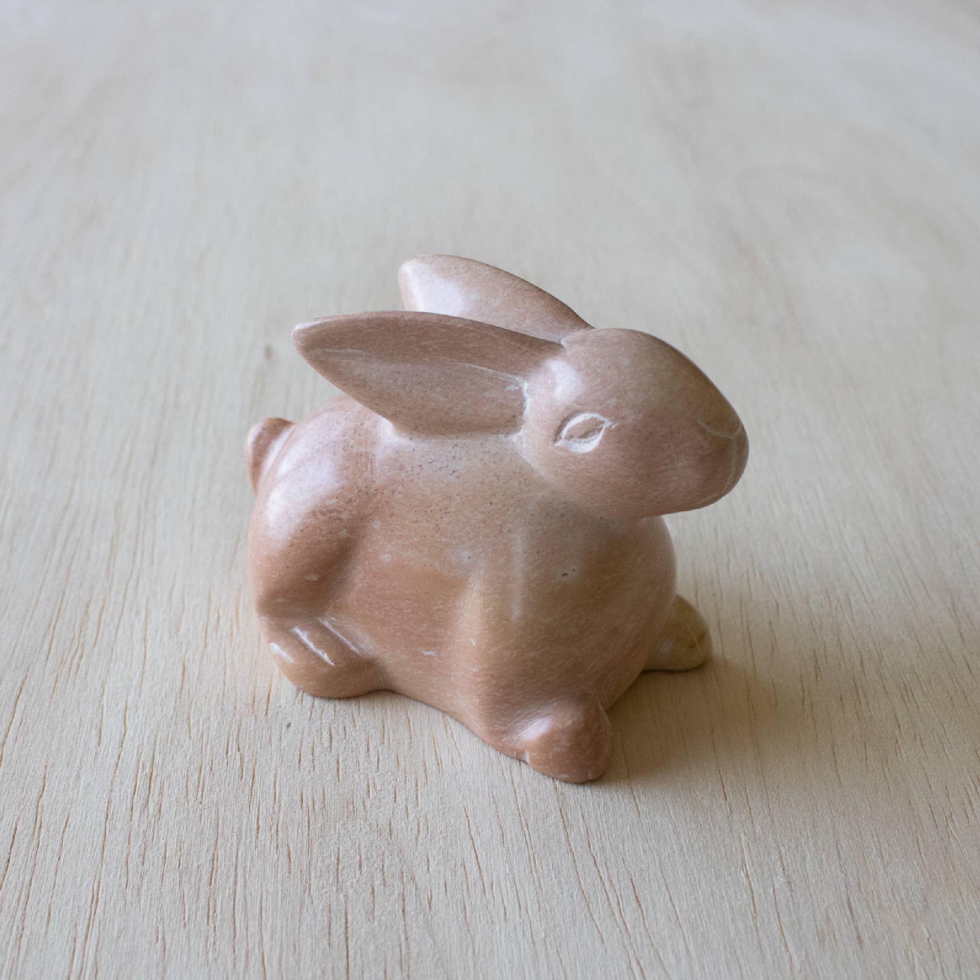This natural bunny is a fair trade product handmade in Kenya. It is hand carved out of stone, sanded until smooth, and then polished. Since it shows the natural colors of the stone, some color variations should be expected. One can often see shades of cream, gray, pink, and brown in the design. Sold individually. Approximately 2.25 inches tall.