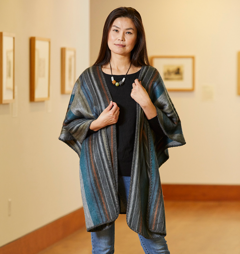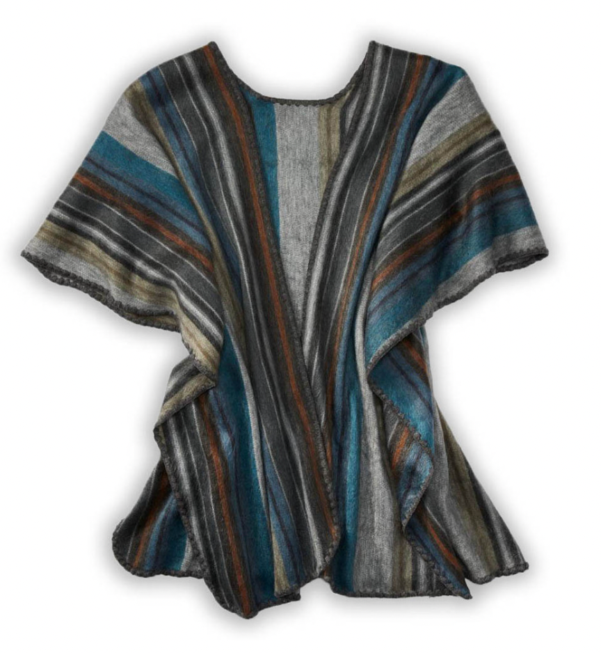 This soft, striped poncho in blue hues is woven on hand looms by artisans in Ecuador. Great for layering over blue jeans or slacks. Pair with handmade earrings or bracelets for an all-over fair trade look! 100% acrylic. Hand wash. Dimensions: 71"l x 45 1/2"w.