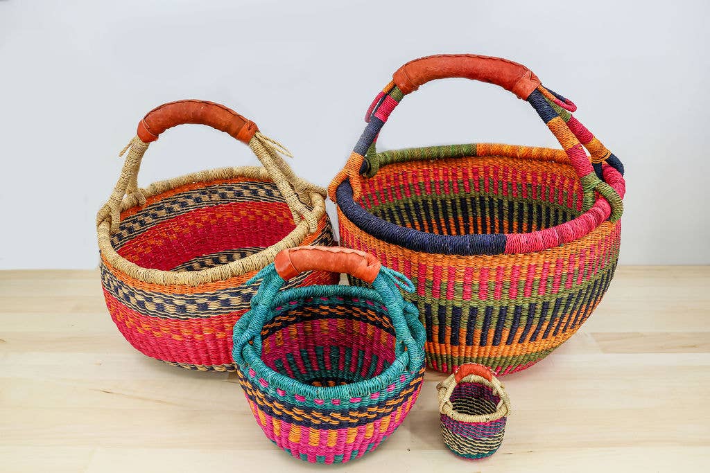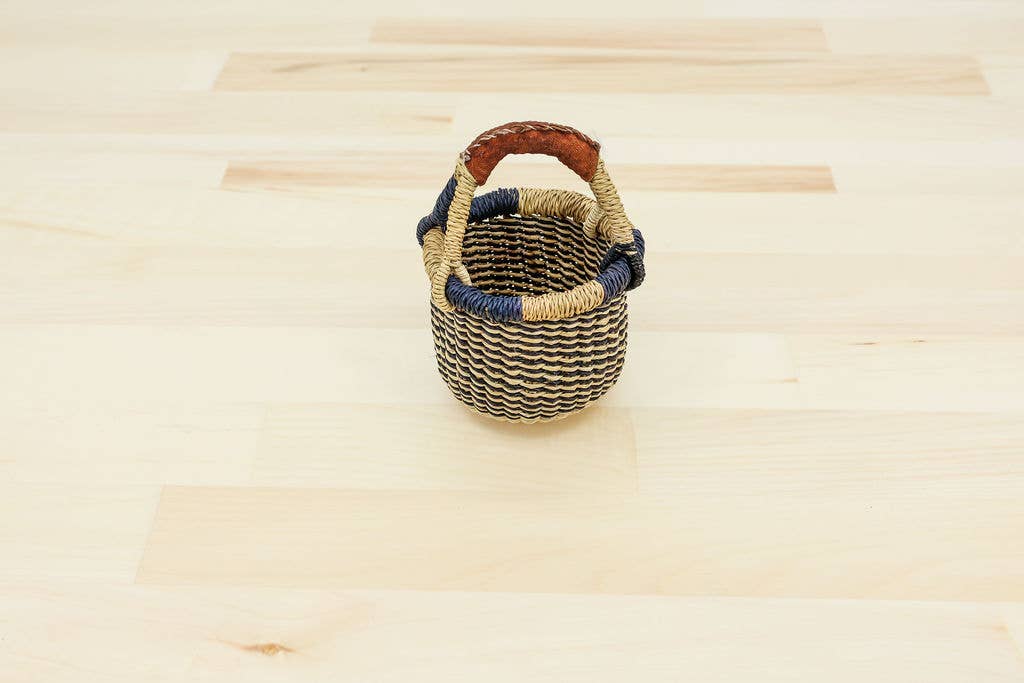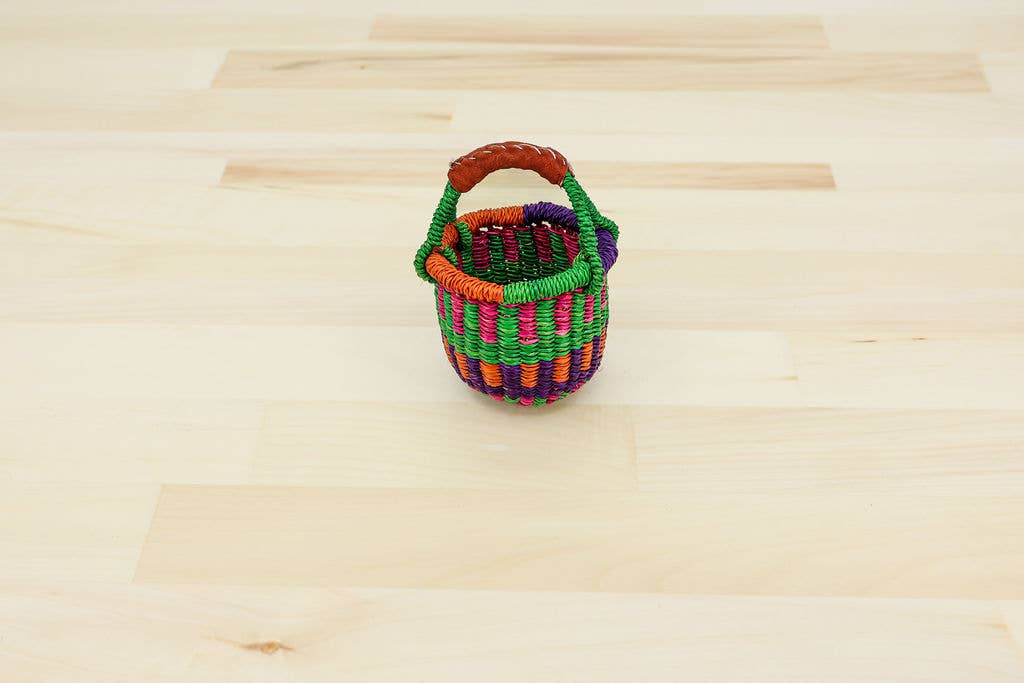Our fair trade mini Market Basket is handwoven from hand dyed Kinkanhe straw and come with a genuine leather handle. Our mini market baskets come in assorted sets of ten; each basket colorway is unique. Kinkanhe straw, also known as vetiver or elephant grass, aids in soil and water conservation, helping smallholder farmers with environmental rehabilitation efforts, including erosion control, runoff retention and remediation of polluted land and water. Dimensions: depth 2.5" x diameter 3" Material: elephant grass, leather