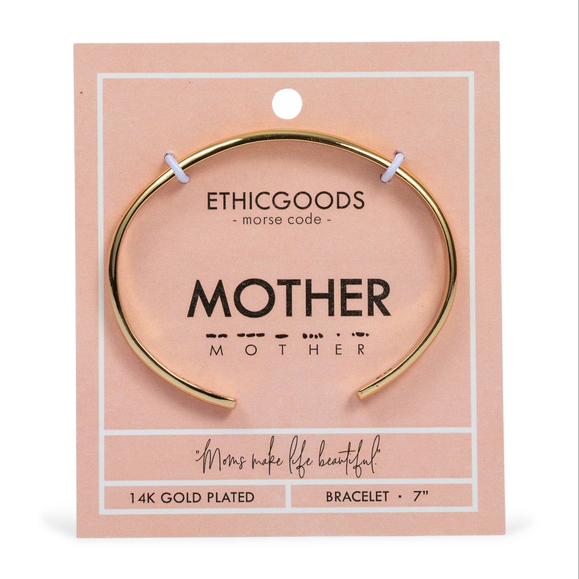 MOTHER Moms make life beautiful. This classic gold Morse Code Cuff Bracelet is perfect for expressing yourself in a subtle, meaningful way. Handcrafted on a half-round, 14k gold plated metal, it features a stamped morse code pattern. Look great and stay ethical with this unique piece! We’d love to hear what your jewelry means to you. Share your story and photos with us! @ethicgoods Details * 14k gold plated brass * Adjustable * Measures 7 inches * Ethically