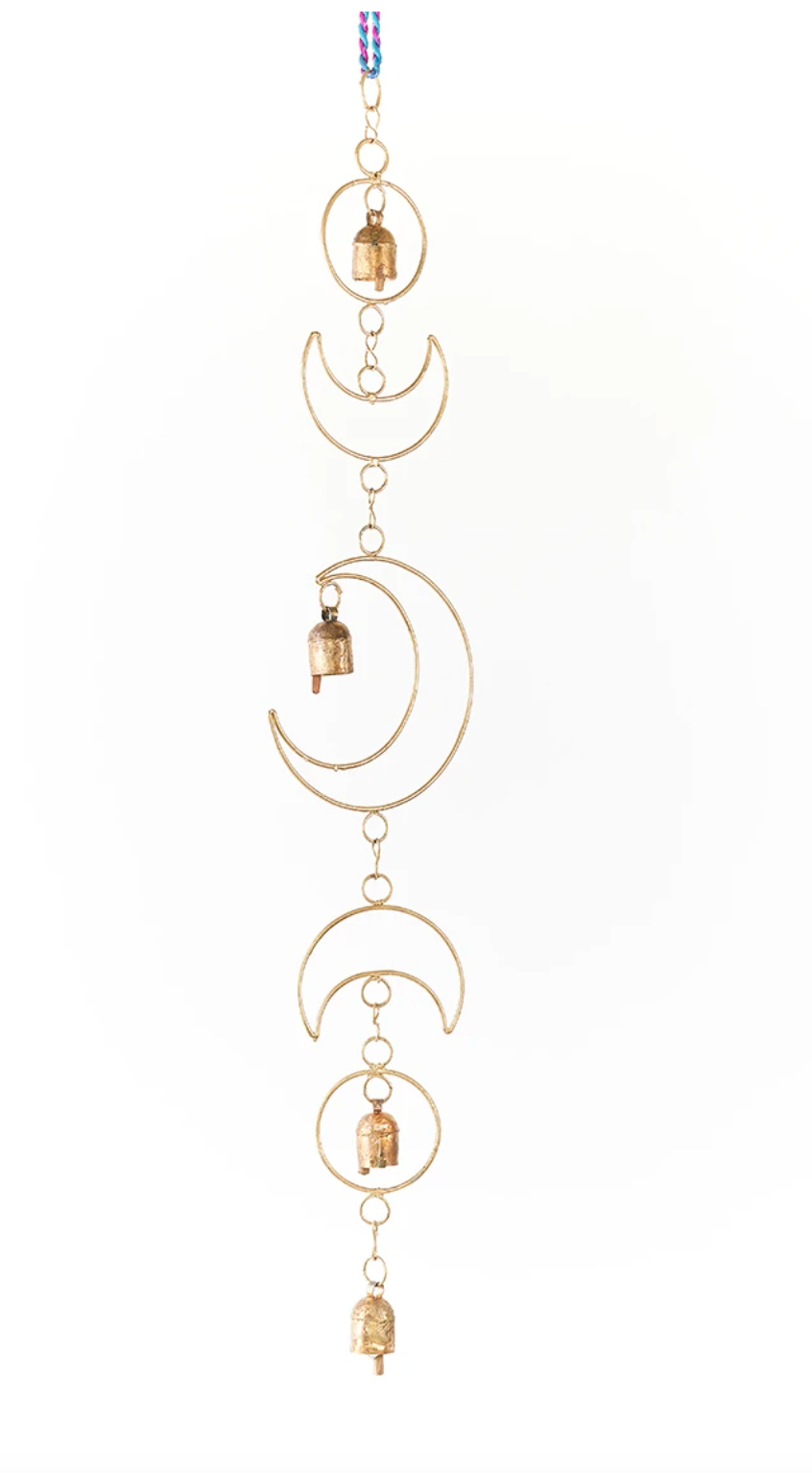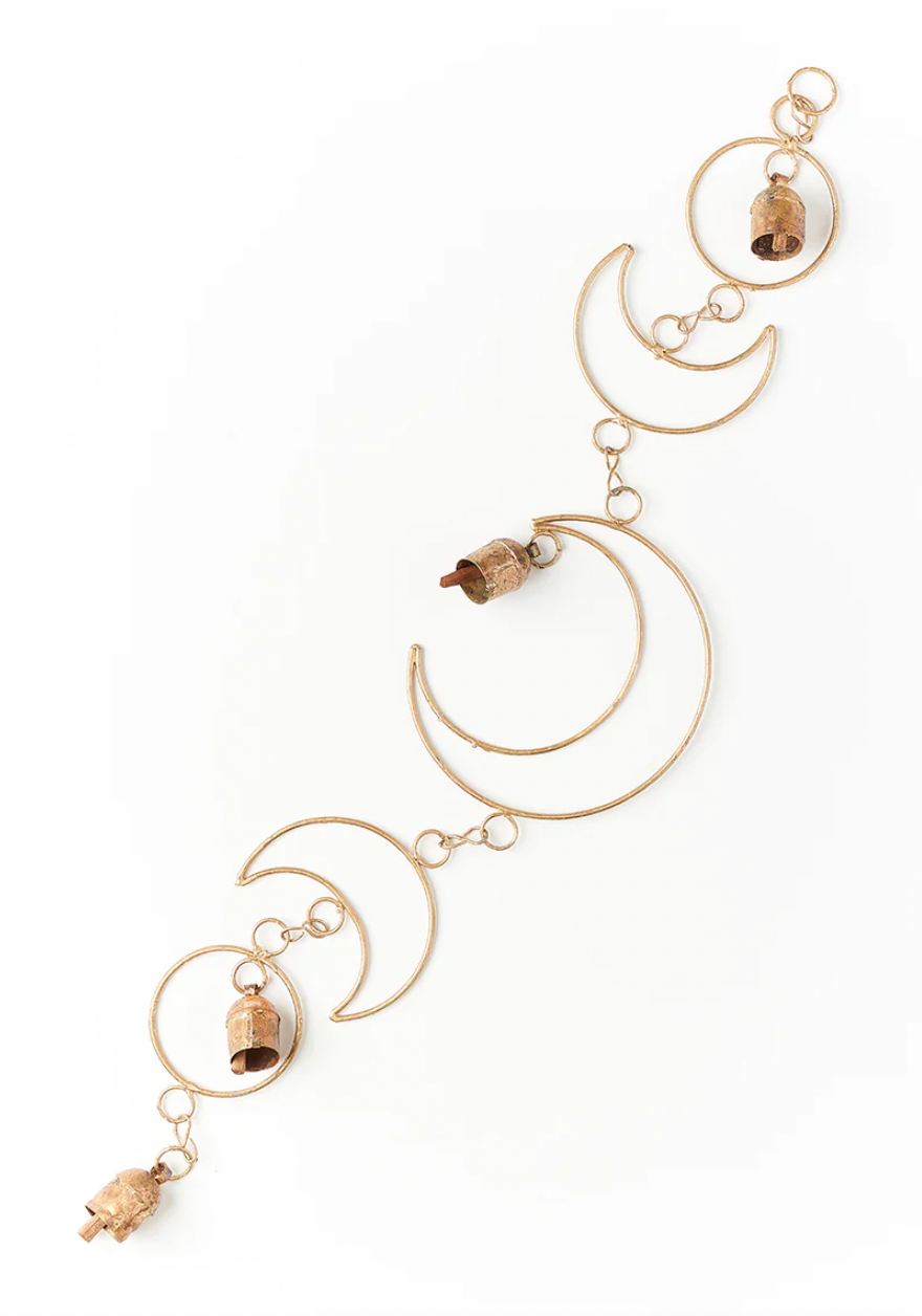 Our Indukala Chime Collection incorporates age-old bell making and metal craft techniques in modern, lunar-inspired designs featuring upcycled iron and copper bells and accents. Bell making is a traditional artform passed down for generations in the desert Kutch region of India. This enchanting bell chime features a cascading crescent moon design with four handcrafted Indian bells, finished with a convenient hanging loop.