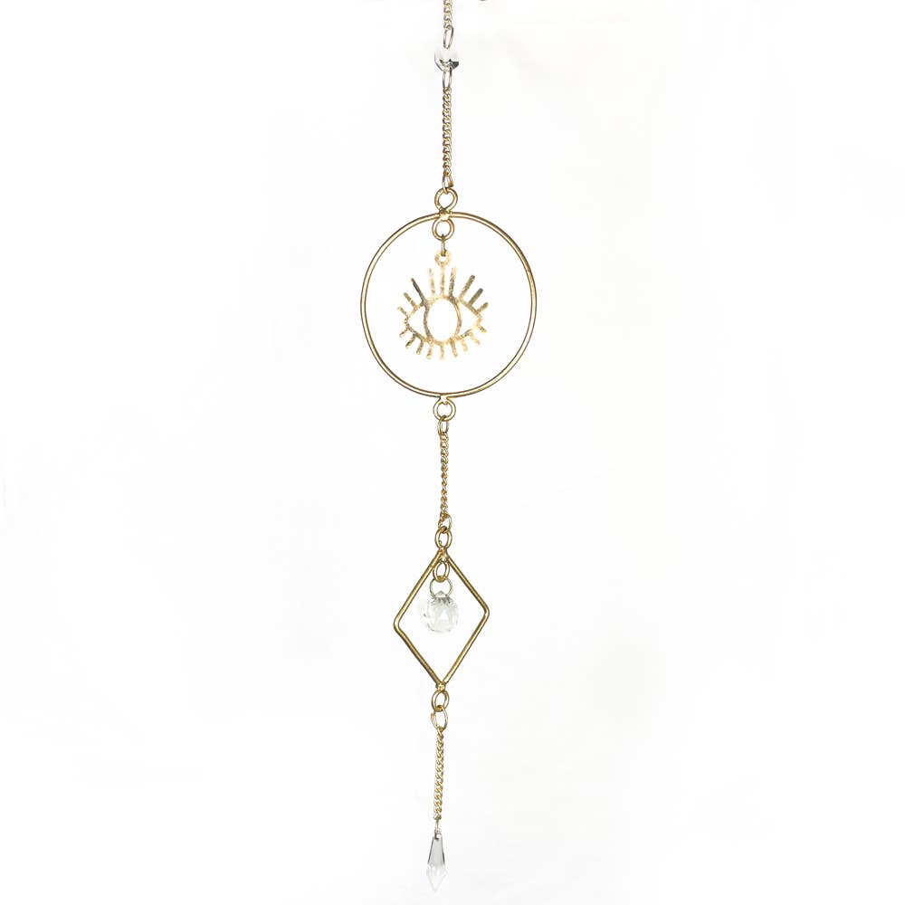 Ward off negativity entering your space by hanging this lovely Evil Eye Sun Catcher in your home or workspace. It features a golden eye inside a circle and below the eye is a small glass crystal ball. There is another little glass crystal at the top of the suncatcher and the bottom is adorned with a glass icicle crystal that ties the whole thing together. If hanging outside we suggest spraying the metal parts with a clear coat to prevent rusting. Made from reused metal Gold finish Indoor & outdoor use "Crystals" are made from glass Size: 22" L x 4" W