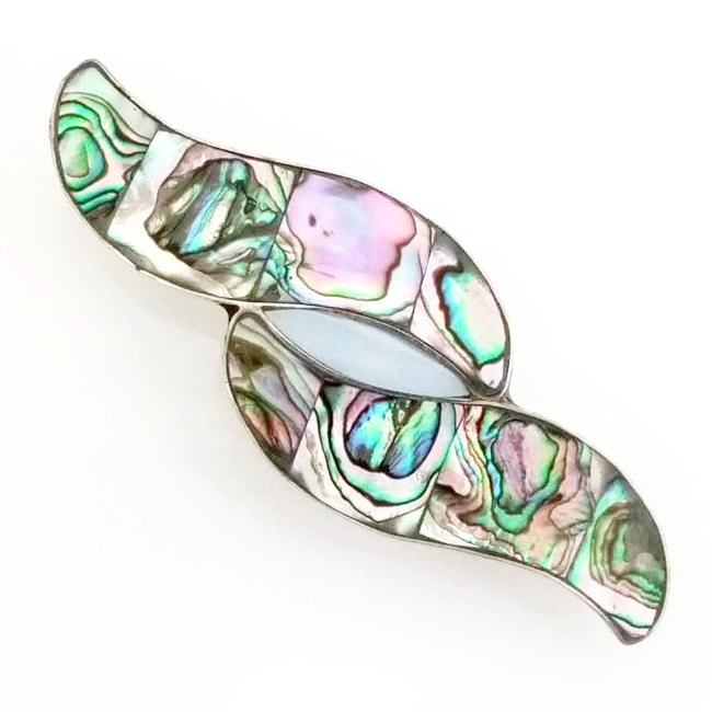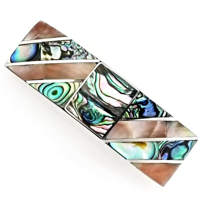 Finest inlaid large barrettes inlaid using exclusively mother-of-pearl, lavender mother-of-pearl, and pacific abalone. Blue Pacific abalone, Mother-of pearl, and Lavender Mother-of-pearl produce a lustrous rainbow-like play of color that changes with the angle of view. Blue Pacific abalone, Mother-of pearl, and Lavender Mother-of-pearl are deep-rooted in the vitality of the ocean and has a strong connection with nature and mother earth. Calming and soothing, they express the gentleness and beauty of the sea. Every barrette is one of a kind. These beautiful barrettes are Guaranteed 100% Fair Trade. Blue Pacific abalone, Mother-of pearl, and Lavender Mother-of-pearl inlays may vary from product images. German Silver Also Known As Alpacar (Non-Precious)