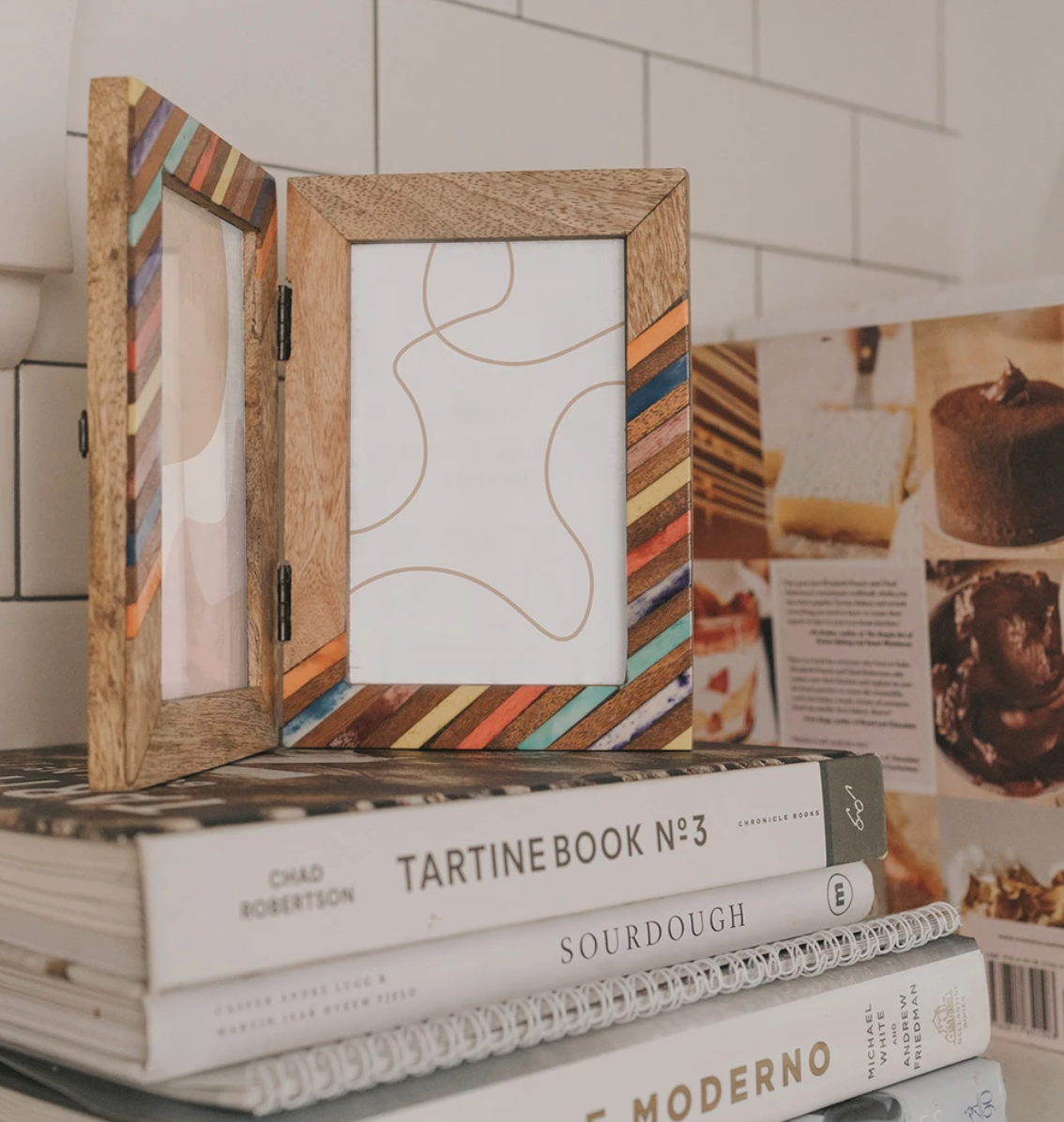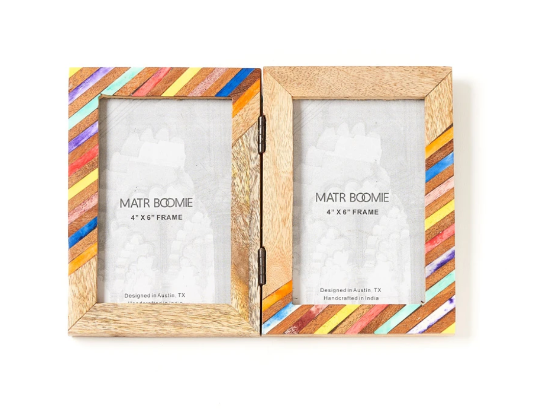 Our Banka Mundi Collection incorporates traditional Indian art forms in modern designs featuring ethically sourced bone and sustainably harvested mango wood. Master artisans in Old Delhi skillfully hand carve wood and bone elements to create unique, eye catching inlay designs. For convenient display, this hinged double frame features an adjustable, self-standing design and d-ring for hanging. Frame accommodates two 4" x 6" photos or prints, easily accessed with metal swivel tabs and removable backs.