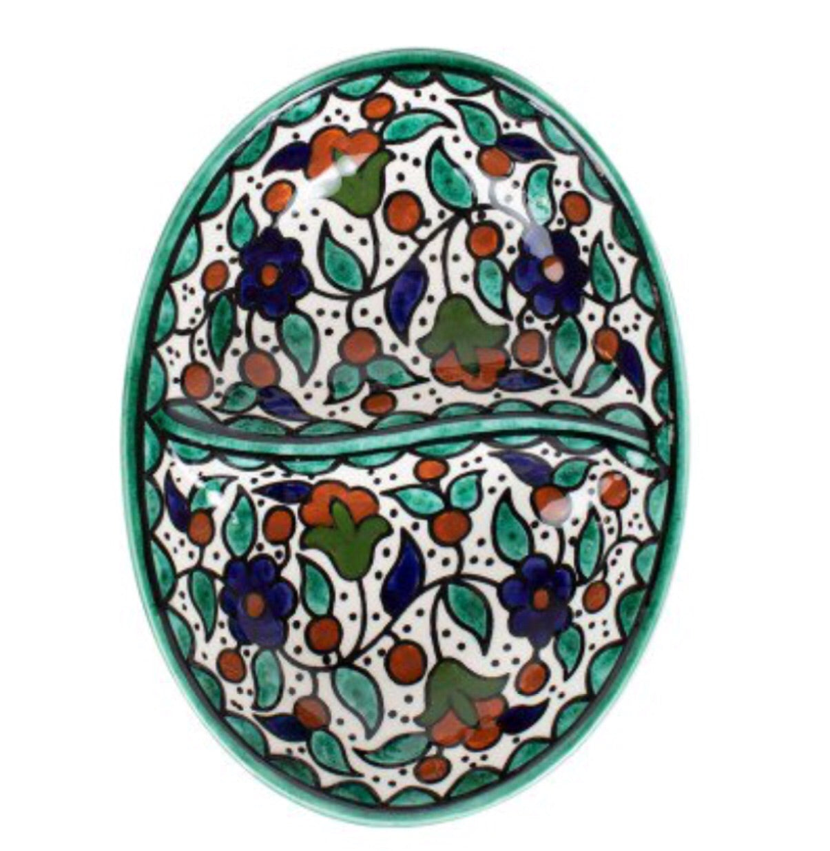 The Folklore Divided Dish is hand–painted by artisans in the West Bank. These one–of–a–kind ceramic serving dishes are handcrafted and designed by Hebron Glass.