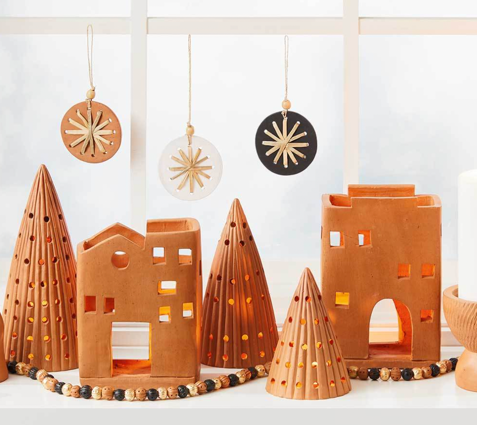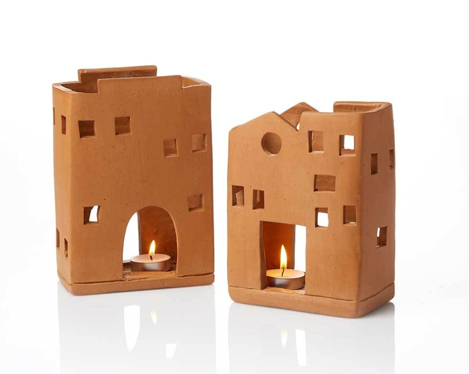 Simple and elegant, this pair of house-shaped candle lanterns is made from natural terracotta finished with soft edges. Pair with LED tea lights or votives (not included) to bring a soft glow to any room. Display with our Matira Tree Lanterns and Matoko Nativity for a modern take on the traditional Christmas village! Set of 2. Sm: 7"h; Lg: 7 1/2"h