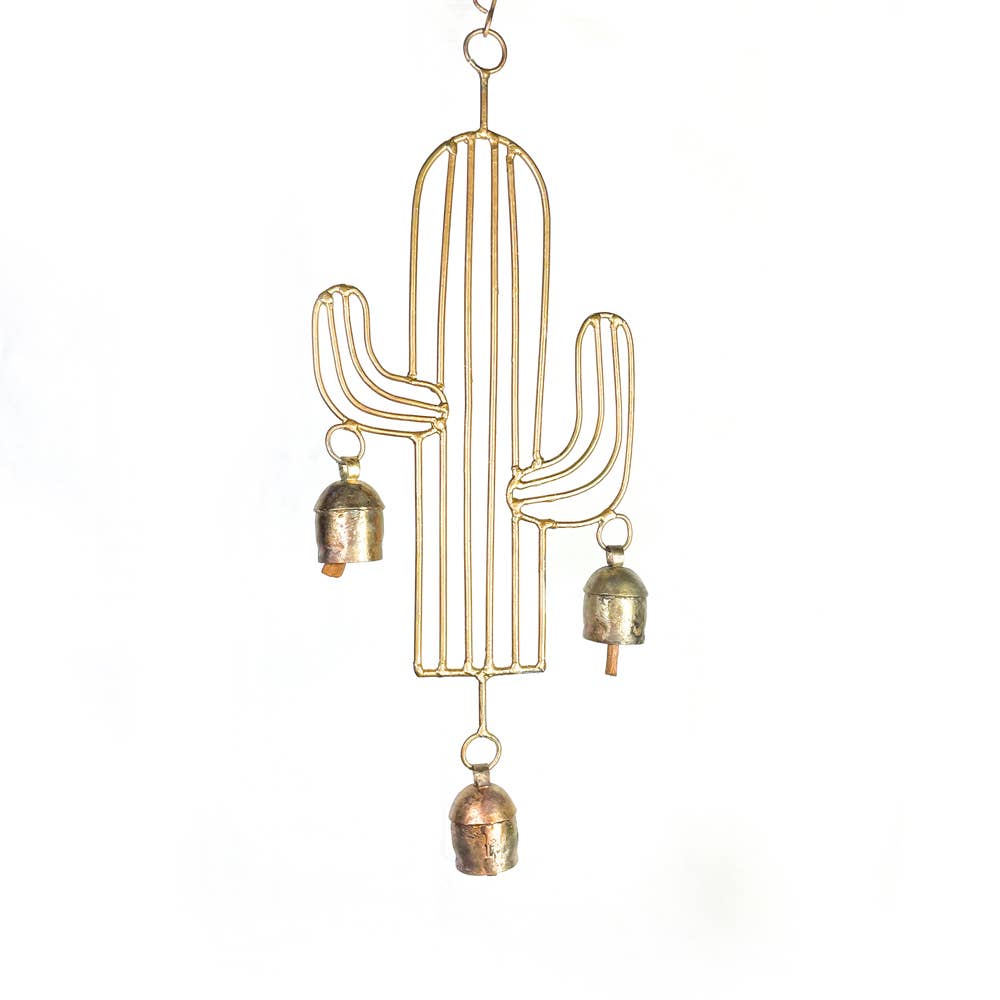 Calling all plant lovers! This Golden Cactus Chime is one of a kind! Perfect for house plant enthusiasts and gardeners alike! This beauty features an airy gold frame in the shape of a beautiful cactus and three mini bells at the bottom. If hanging outdoors, we recommend spraying your chime with a clear coat to preserve its longevity.
