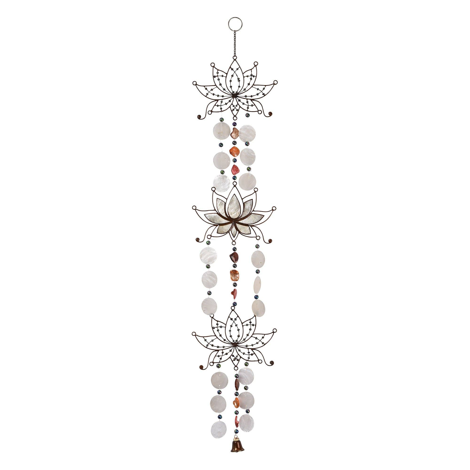 Stunning lotus chime handmade with capiz, shells, beads, wire, and a bell. Delightful addition to an outdoor or indoor space. Top and bottom wire lotus come adorned with beads, middle lotus...