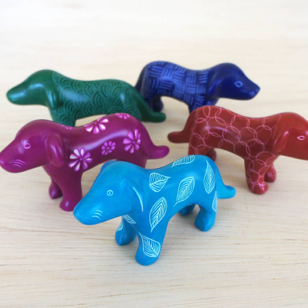 These colorful standing dogs are a fair trade product handmade in Kenya. They are hand carved out of stone, sanded until smooth, and dyed. Then an artisan uses a knife to etch the patterns into each dog. Sold individually. Approximately 3.75 inches long.