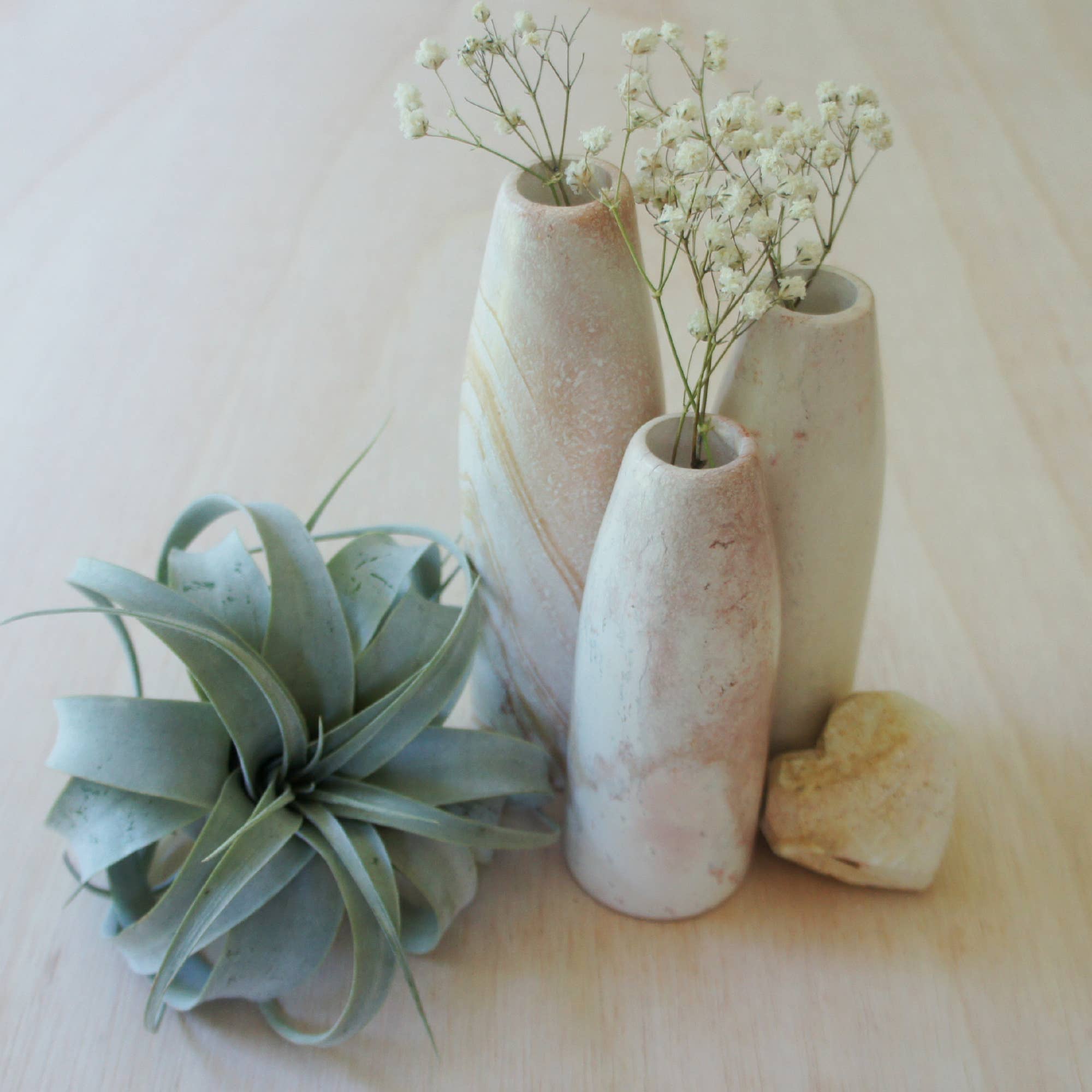 These natural candleholder vases are a fair trade product handmade in Kenya. They are hand carved out of stone and then sanded until smooth. These feature an inner ledge to hold standard taper candles (the opening is approximately ⅞ inches wide). If the taper candle fit is too snug, try trimming up to 1 inch off the bottom of the candle for a better fit. These are also designed to hold flowers as the center hole drops down within 1 inch of the base. For decorative use only with dried flowers or botanicals; not intended to hold water. Since these vases show the natural colors of the stone, some color variations should be expected. One can often see shades of cream, gray, pink, and brown in the vases. Sold individually. All vases are approximately 2 inches wide. The large vase stands 6.5 inches tall.