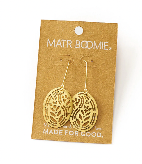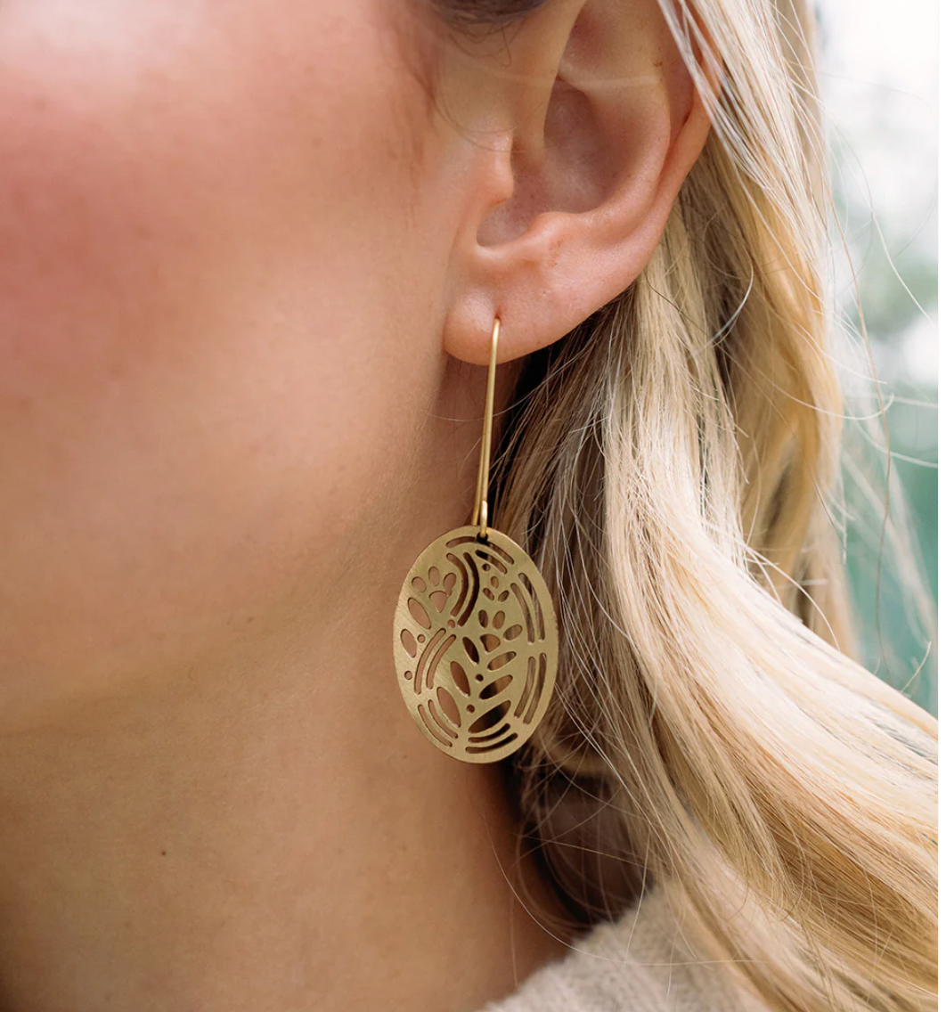 The Adhya Oval Drop Hook Earrings, feature gold tone on brass in a cutout design. Traditional jewelry making meets modern design. The simple yet artistic design can be worn day and night to add a special touch of elegance.