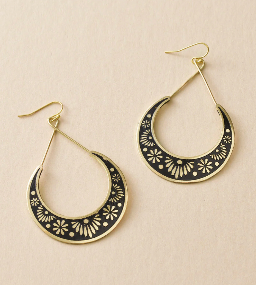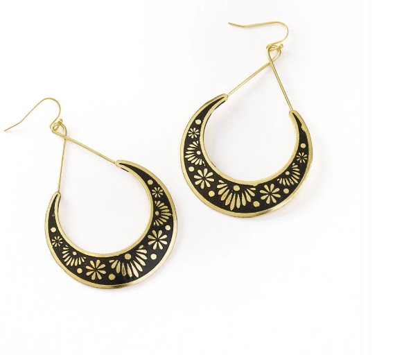 The Nisha Crescent Moon Hoop Earrings feature a damascene jewelry making technique which gives them the gold tone on black effect. These statement earrings are sure to get the wearer comments...