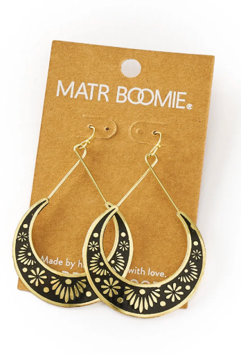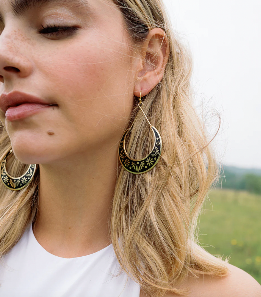 The Nisha Crescent Moon Hoop Earrings feature a damascene jewelry making technique which gives them the gold tone on black effect. These statement earrings are sure to get the wearer comments and compliments!
