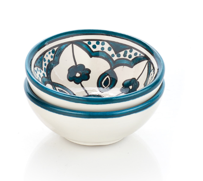These brilliantly colored ceramic dipping bowls are crafted in the ceramic traditions long part of the Palestinian city of Hebron, and emphasizing the beauty of nature. Glazed and high fired to a glossy finish. Each sold separately and hold 4 oz. each: 1 1/2"h x 3 1/2"dia