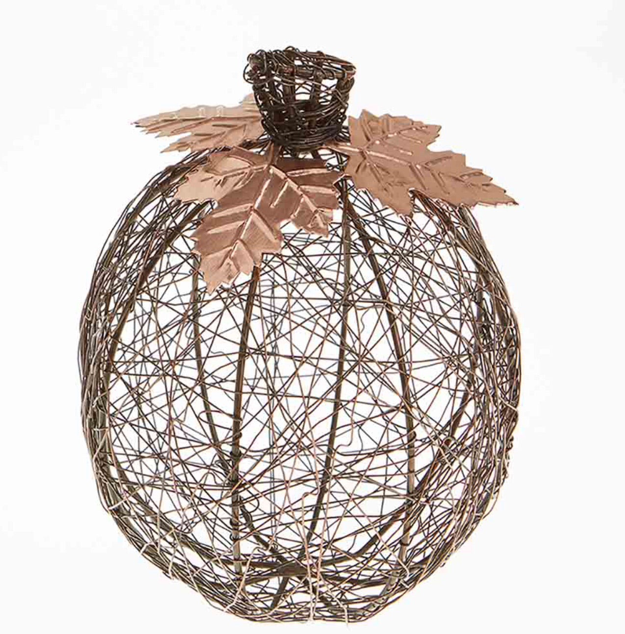 Iron pumpkin is intricately wire wrapped and topped with bright embossed copper leaves. Contains 50% recycled iron. Antique copper finish. 8"h x 5.5"dia. Made in India