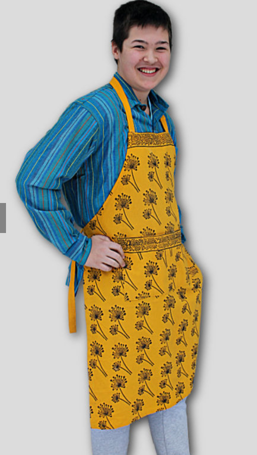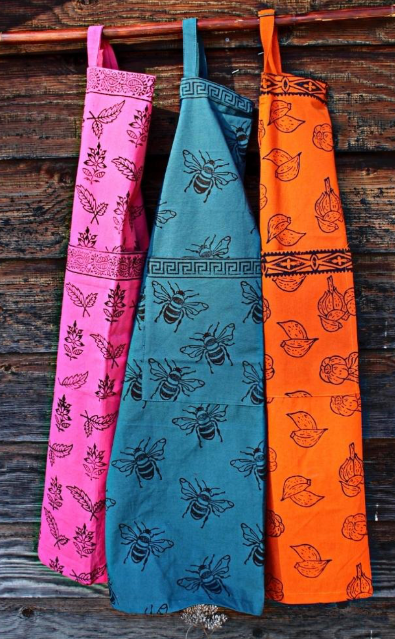 Blockprinted apron with adjustable neck and front pocket, assorted colors/designs. Inquire about current selection.