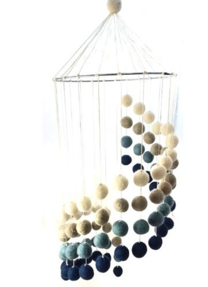 Gorgeous mobile of felt balls hung on a metal hoop.  Hoop measures 8.25″ in diameter. Assorted colors.   Stunning work from the village of Sertung! Colors will vary!