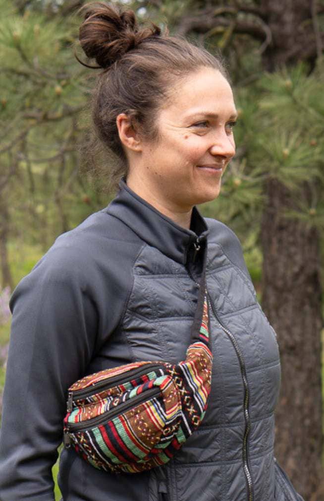 Colorful cotton gyari fanny pack in small size, 6.25″ tall x 9.5″ wide, assorted colors.