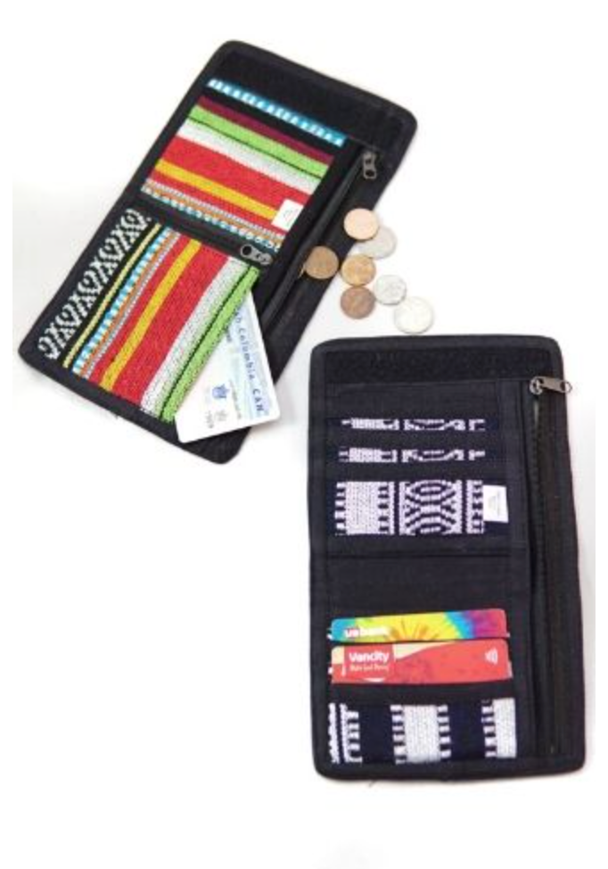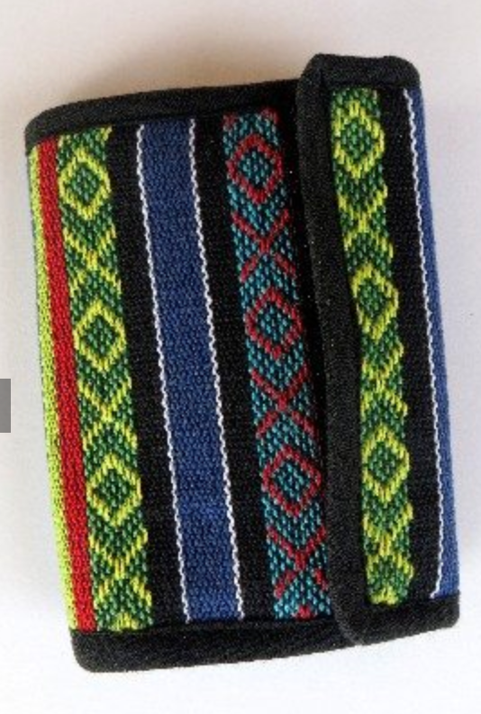 Gyari pattern cotton tri-fold wallet with velcro closure made from the scraps of beautiful cotton gyari bags and jackets. This has been a favorite seller for many years and we love not having to throw away small pieces of beautiful handwoven fabric. One full-length zippered pocket. One zippered compartment and six credit card slots. Assorted colors of gyari fabric. Open 9″ x 5″ and closed 4″ x 5″.