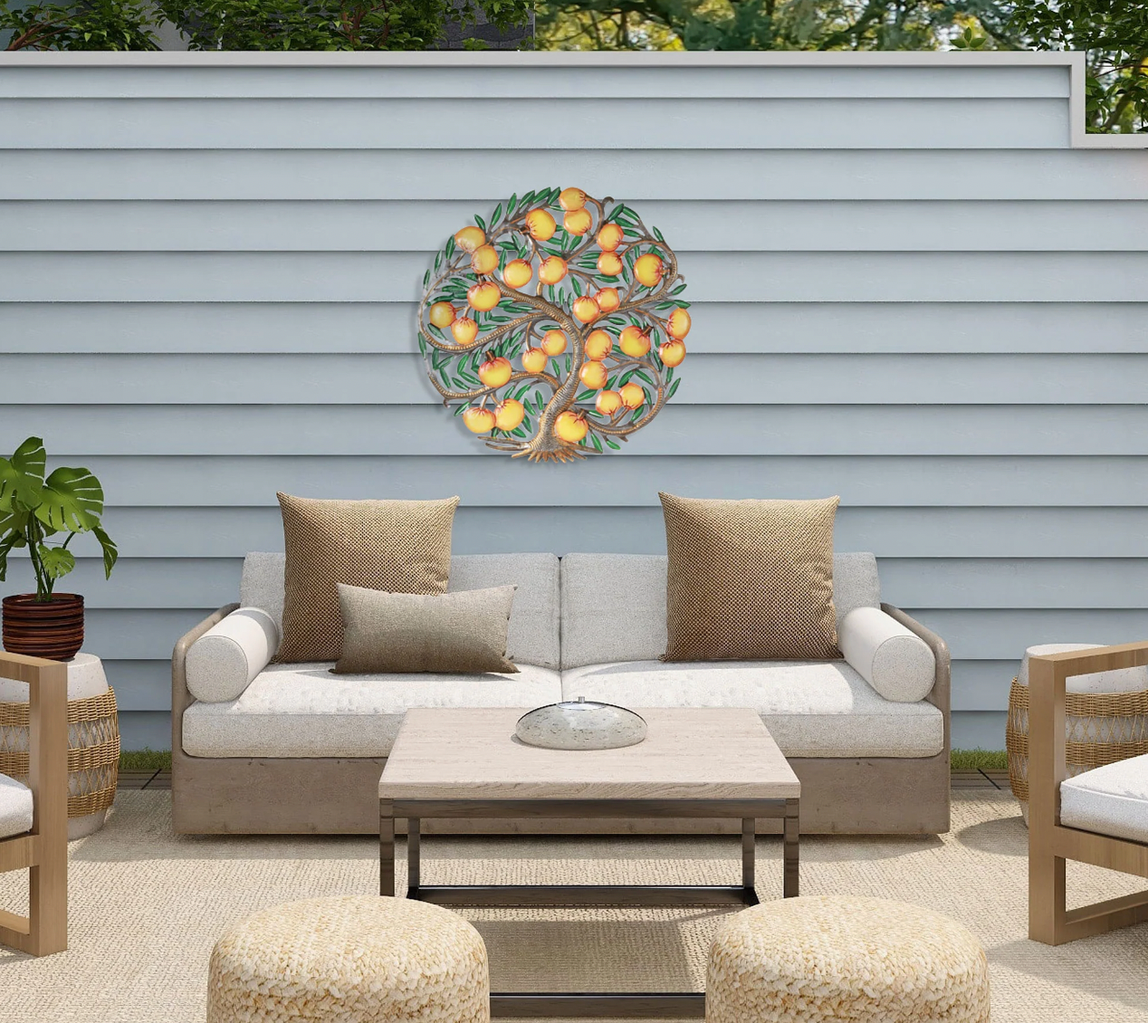 Given the handmade nature of this product please allow for minor variations. As the metal is recovered from recycled oil drums and colored through a burning process it will vary slightly in coloration. Typically the piece has a darkened steel patina. If handpainted, exact colors may vary, which speaks to the one-of-a-kind nature of each piece. Each piece of metal art whether painted or natural is coated with a layer of clear lacquer to help protect the metal.