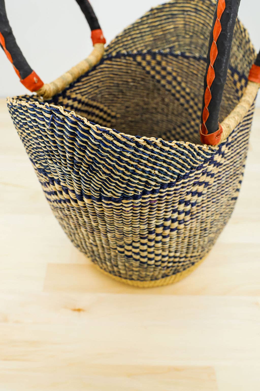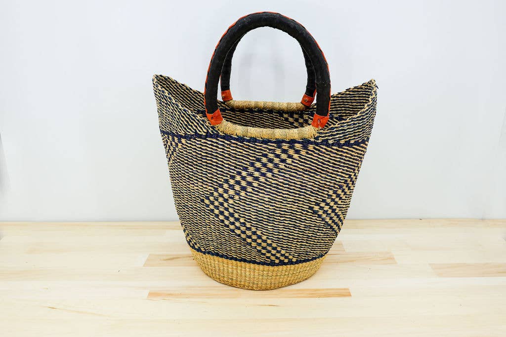 Our fair trade, single weave U-shopper grocery tote basket/ bag Bolga Basket is hand dyed and handwoven from Ghanaian dried vetiver grass and comes with sturdy leather handles. Container or utility baskets like these are durable and can be put to multiple uses, such as: a beach bag, carry-on or weekender, crafting or knitting caddy, farmer's market basket, grocery or shopping bag, hamper or laundry basket, handbag or tote, home decor basket, laptop carrier, picnic basket, pot planter, tabletop centerpiece, or for storage, to name a few! Vetiver grass, also known as elephant grass, aids in soil and water conservation, helping smallholder farmers with environmental rehabilitation efforts, including erosion control, runoff retention and remediation of polluted land and water. Dimensions: diameter 16"-18"; depth 11"-13" Materials: vetiver grass, leather. Colors and styles will vary. GHA BOVU