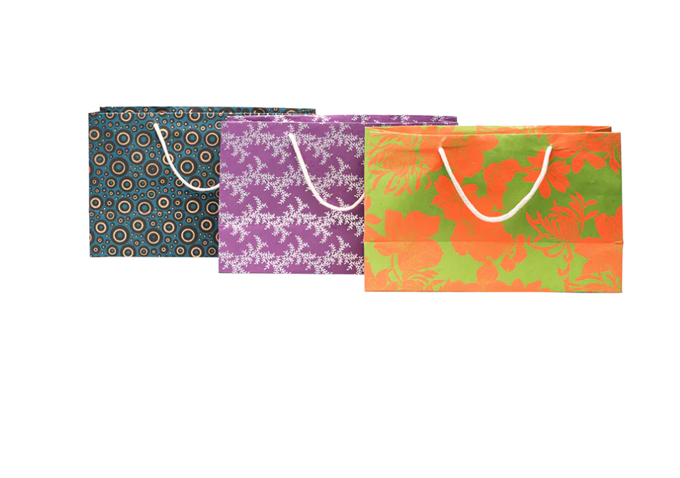 Find elements of surprise in these tree-free paper bags in vibrant colors and patterns. Handmade of soft, compostable 100% recycled cotton. Assorted prints. Sold individually. DIMENSIONS:15" L, 6" W, 9.5" H...