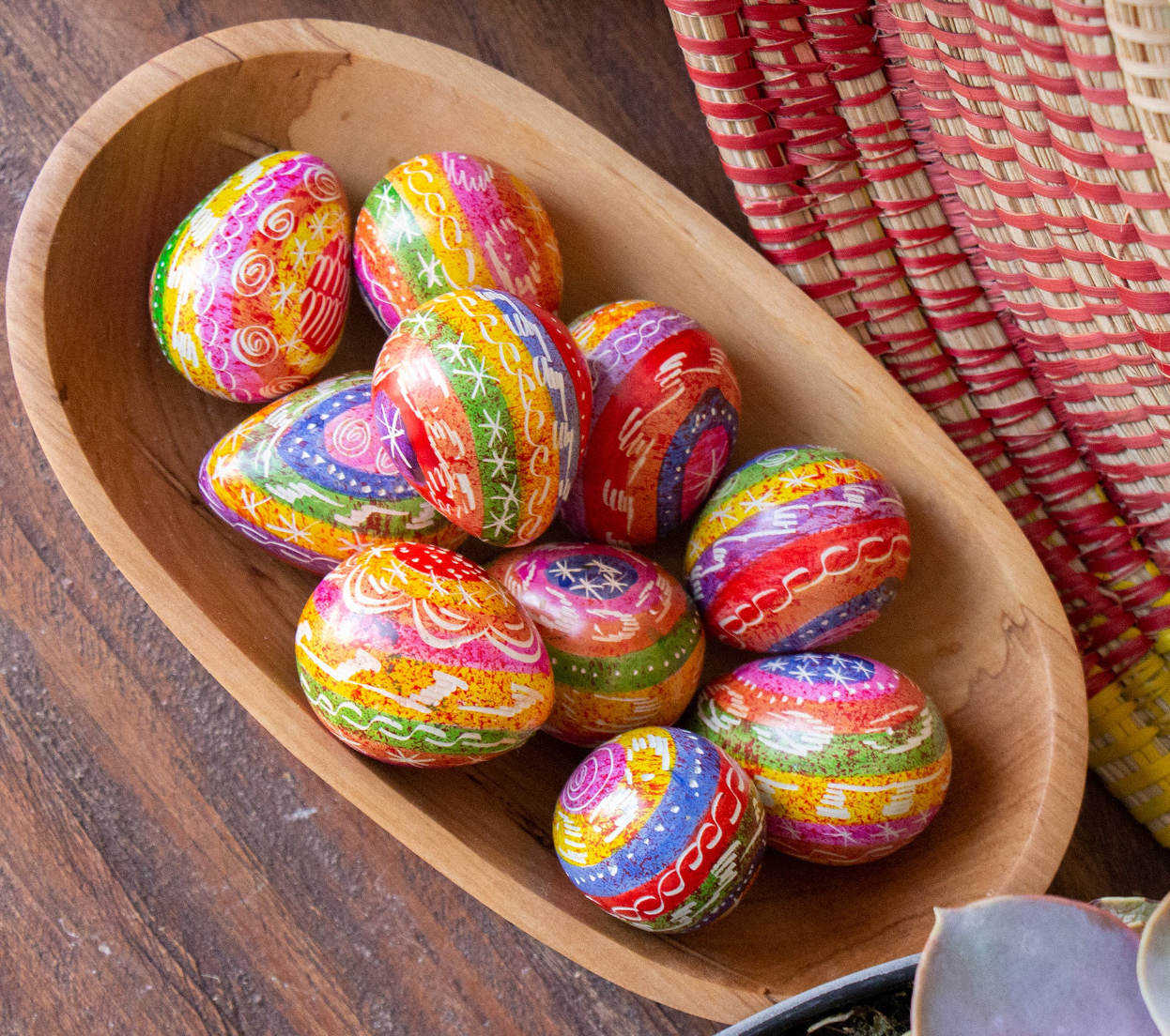 Hand-carved from a single piece of Kisii soapstone by African artisans, each colorful egg is uniquely handmade. The artist painted a range of colorful and cheerful patterns. The whimsical eggs are beautiful displayed in a bowl or glass container on a table. Adorable for Easter-time and year round. Makes a great, ethical gift.