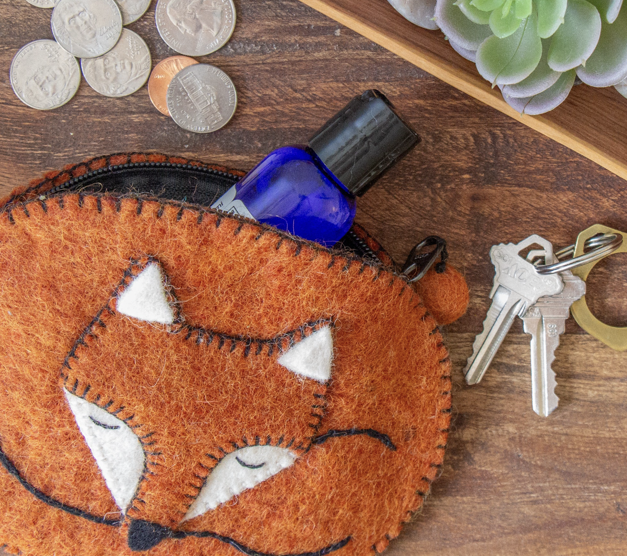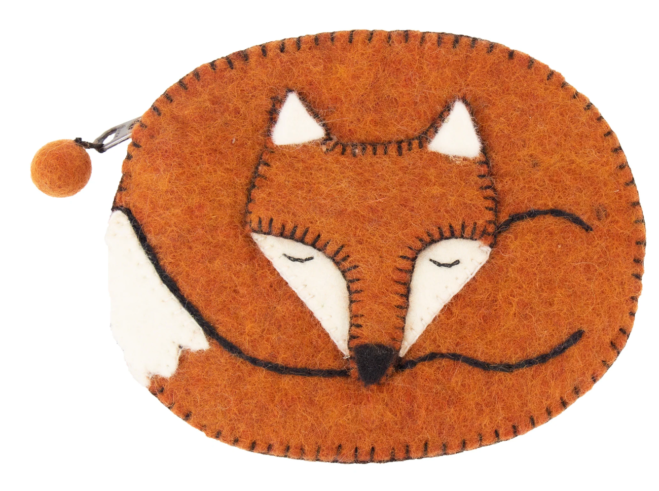 This sleeping fox coin purse is as charming as it is functional. Handmade by women artisans in Nepal. Zipper top with Pom-Pom pull. Fully lined. Measures approximately: 5 inches x 3.5 inches. 100% All Natural New Zealand Wool. Azo-free dyes. Due to the handmade nature, slight variations in size, exact color, shape, pattern, or other characteristics may be evident. Each piece is truly a unique work of art, lovingly crafted by hand. The Art of Felting: The first step to creating these beautiful felt pieces begins with gathering some of the world’s finest sheep’s wool from New Zealand. Making felted wool is an ages-old, time-consuming process of bonding fabric with fiber. This is a physical job where the artisan’s scrub, rub, roll and rinse the wool again and again with soapy water. Once the wool is bound into a sheet and the desired thickness is complete, the felt is laid out to dry. From there, the felt wool is cut and re-worked into many complex shapes and designs. The many sheets of wool might merge several colors to create patterns and layers. This takes a well-trained, talented artisan and is a true labor of love. The end results are colorful, one-of-a-kind textiles that are stunning to behold.