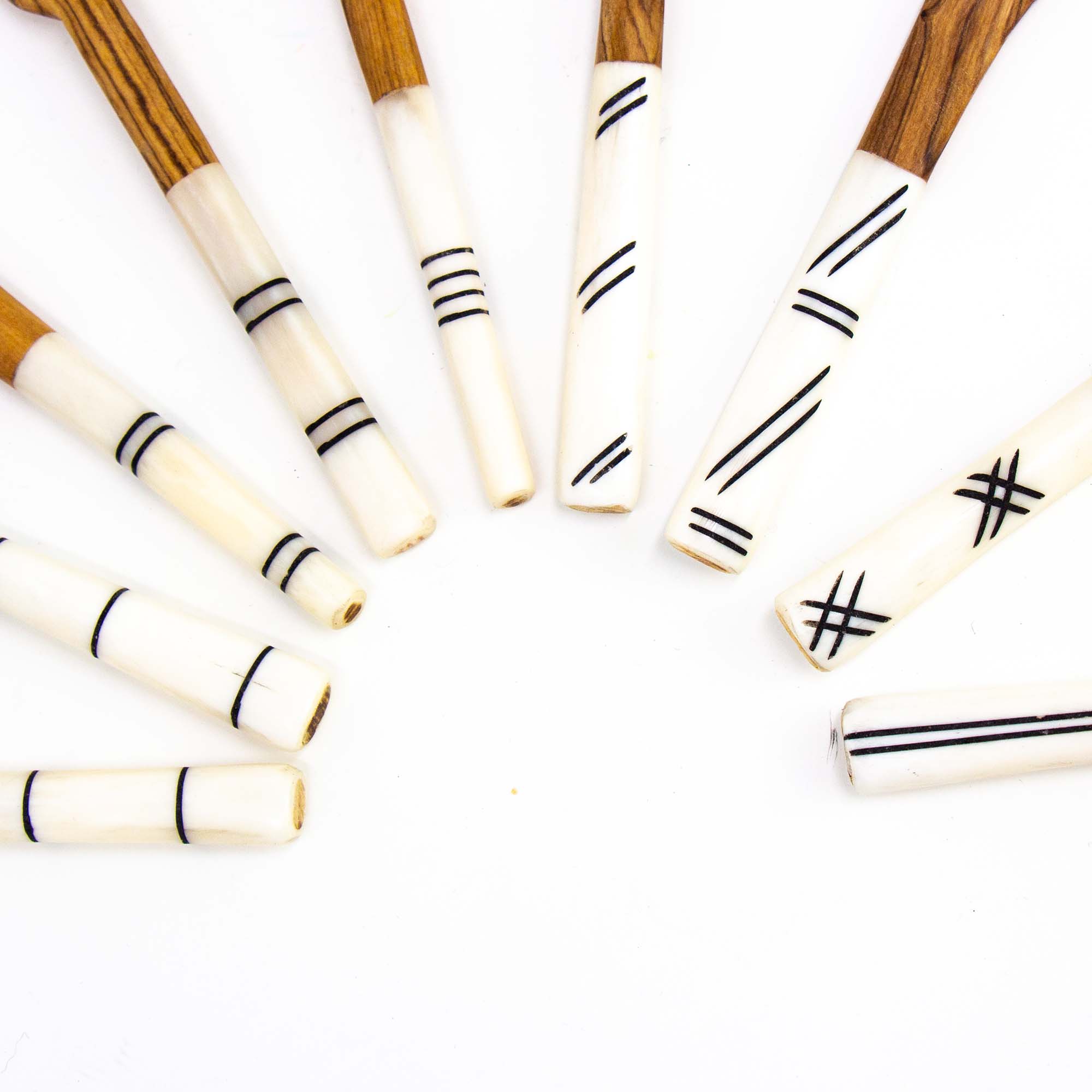 Handmade by artisans in Kenya using traditional methods passed down through the generations, these olive wood and batik handle serving utensils are a beautiful accessory to your appetizer trays or bar area. Product Features: * Hand carved and hand-painted. No two are identical. * Naturally water and stain resistant * Hand wash and air dry * Socially responsible goods that is empowering to consumers to purchase according to their values and help alleviate poverty. Fair trade is so much more than a product assortment. It's about safe workplaces, fair wages + community investment for factory employees. * Made from wood and ethically sourced animal bones that would have otherwise been discarded. Sold Individually