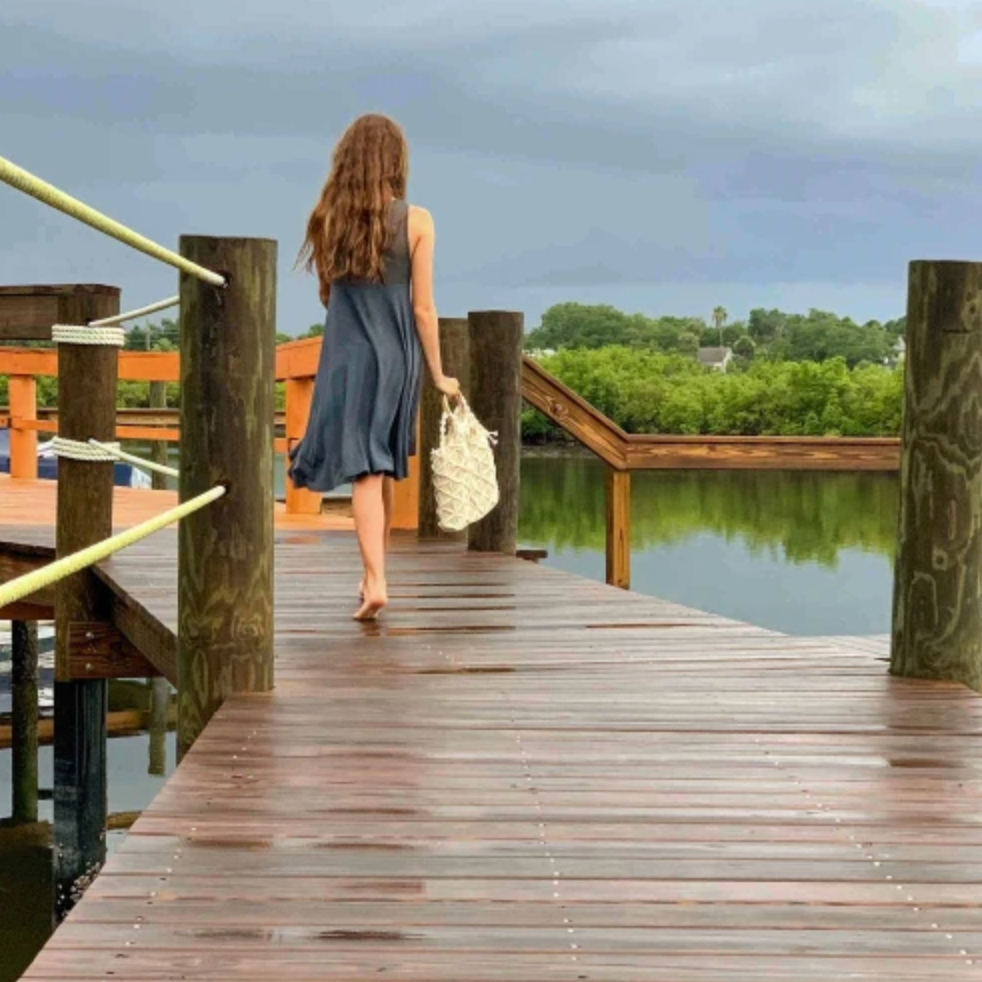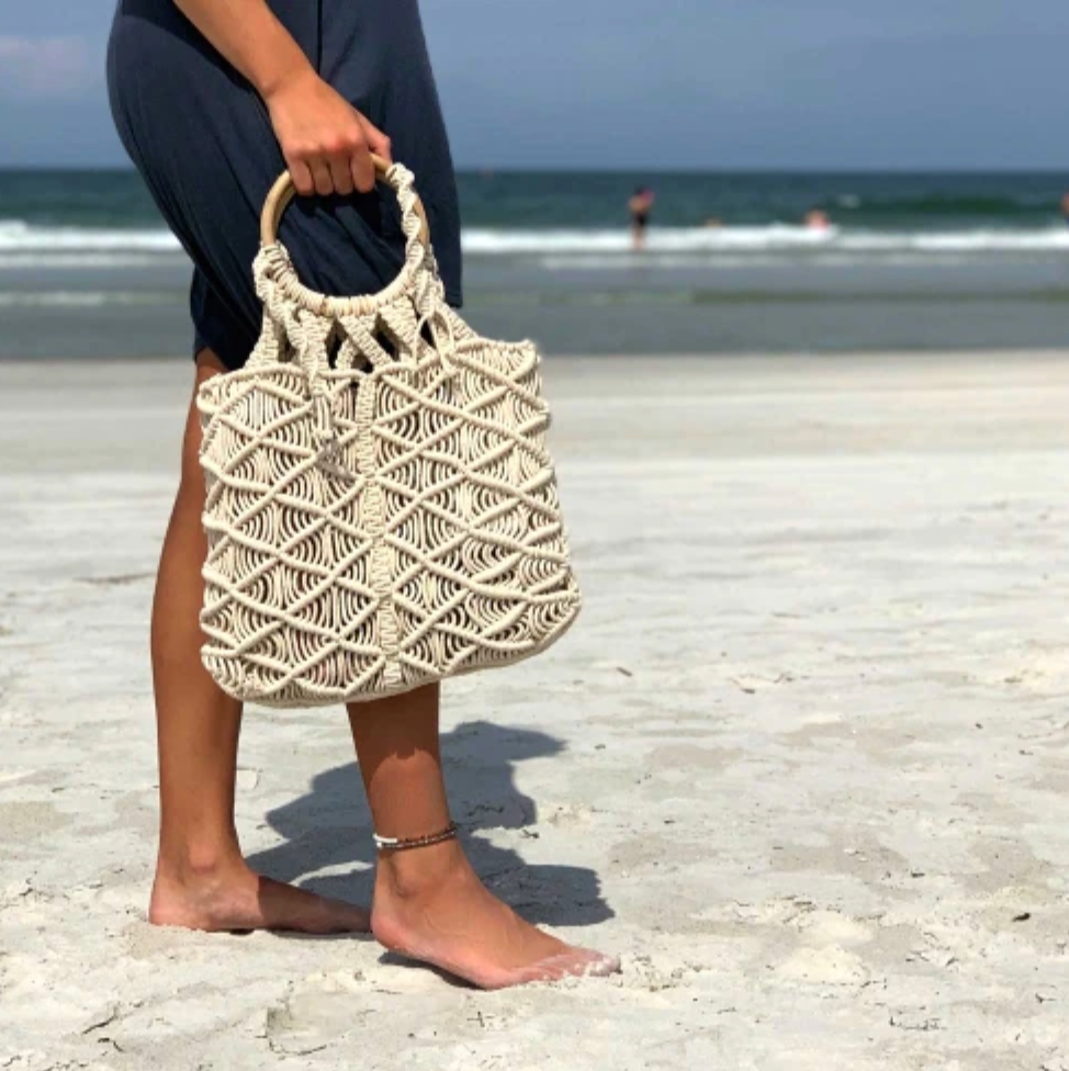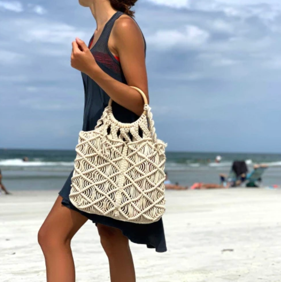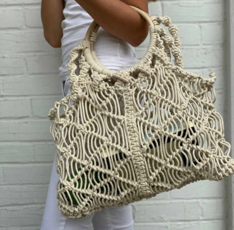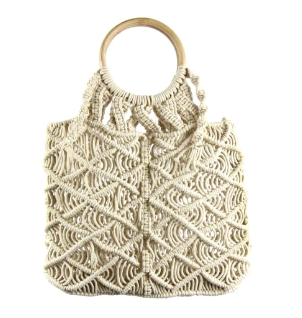 Talk about texture! Grab this bag for your day around town. Features wood handles and open-weave macramé that is expansive yet stylish. Interior is not lined. Dimensions: 15.125 inches wide by 18.75 inches high. Please note due to the handmade nature, dimensions may vary slightly.
