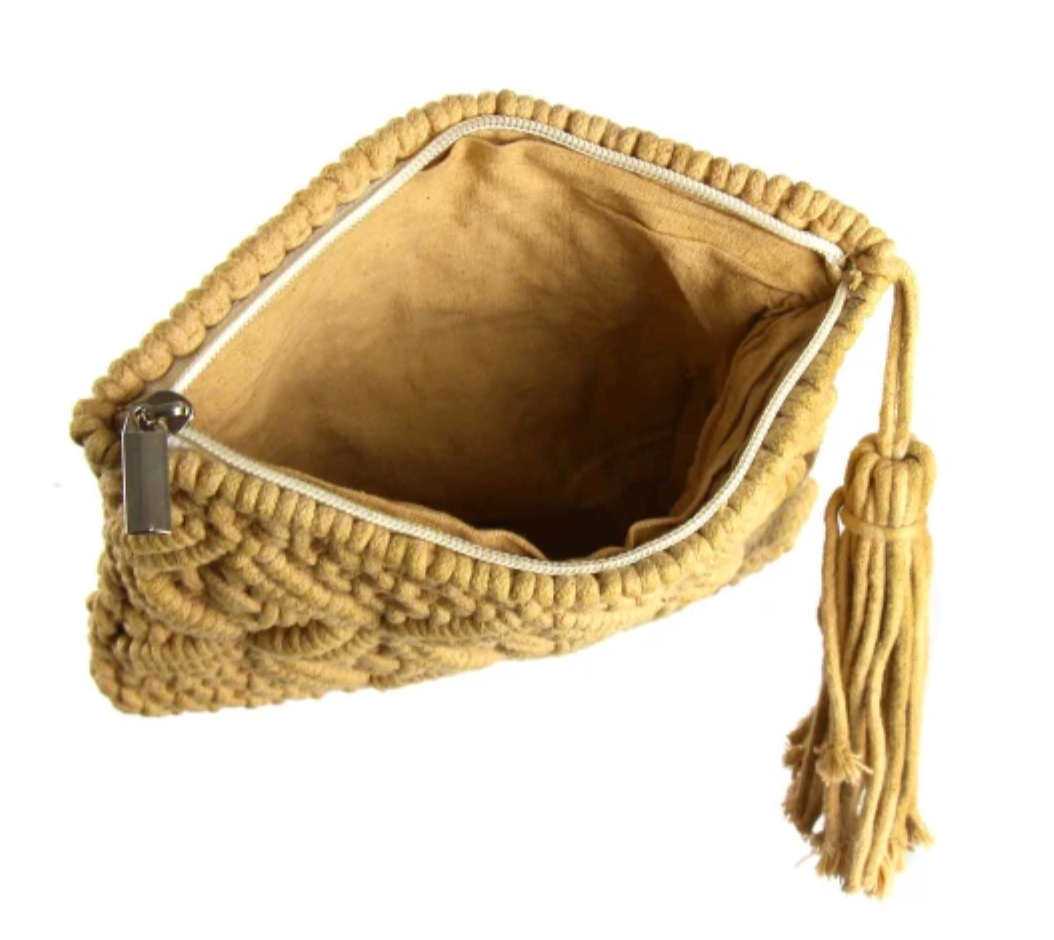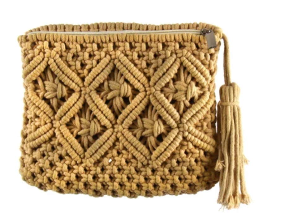 This tan macramé clutch is the perfect complement to any outfit. The bag has a zipper close and the inside is lined. It features a tassel that is a great design touch. Perfect for day or evening. Dimensions: 9.25 inches wide by 6.25 inches high by 1 in depth. Tassel measures 7.25 inches. Please note due to the handmade nature, dimensions may vary slightly.