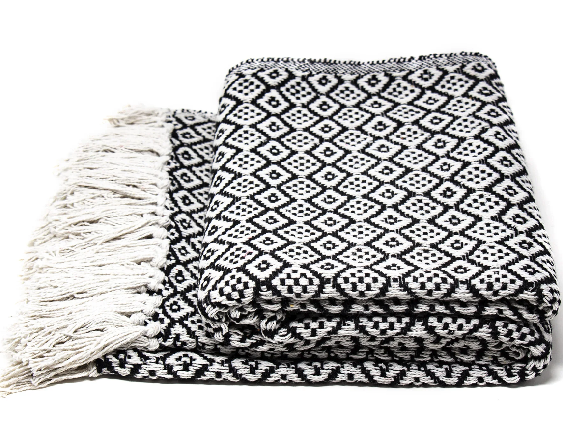 Recycled Cotton Decorative Throw with Tassels, Black & White.  Woven diamond design. Measures approximately 125 x 150 cm. Material: Cotton, Partially Recycled cotton.  Made in India.