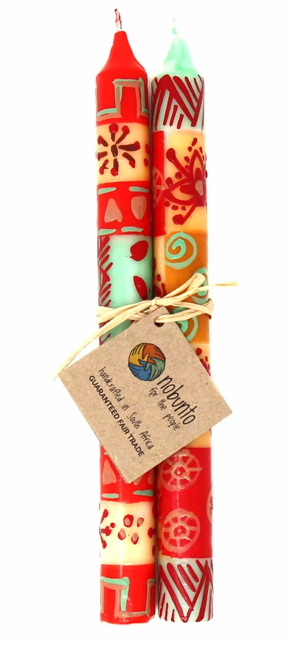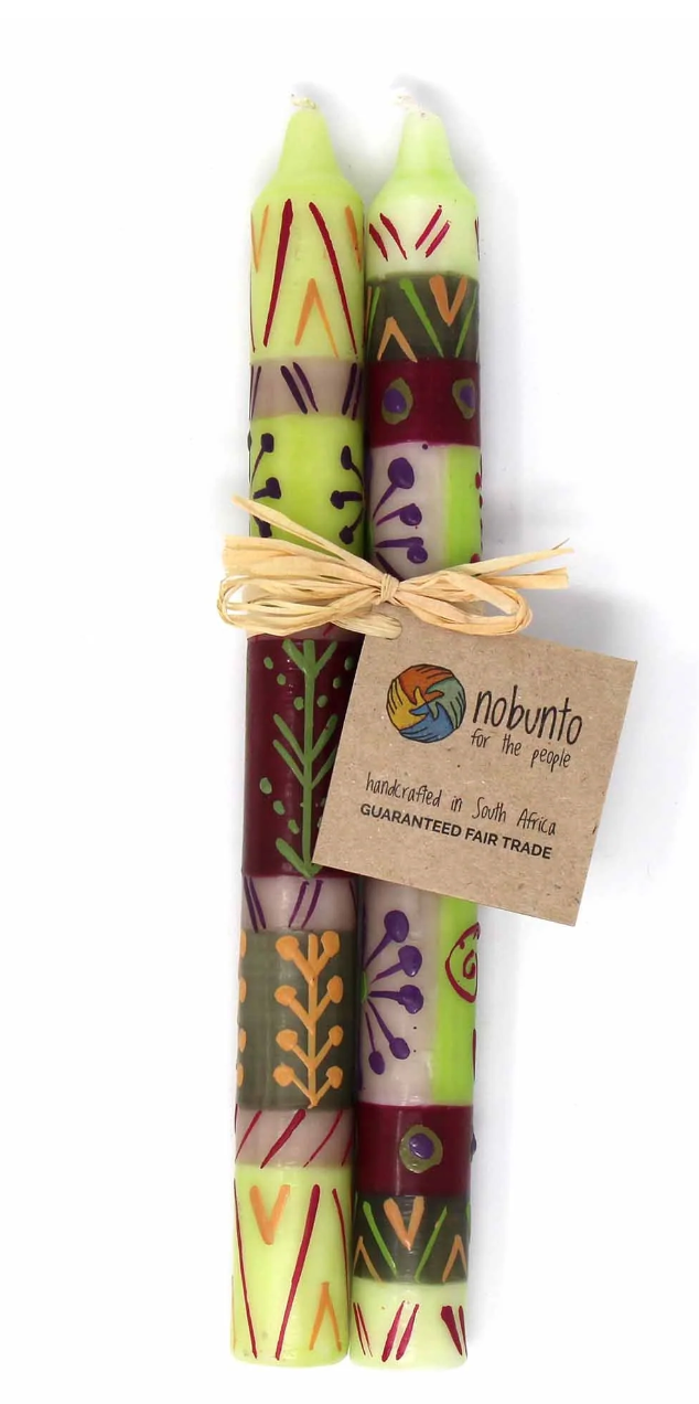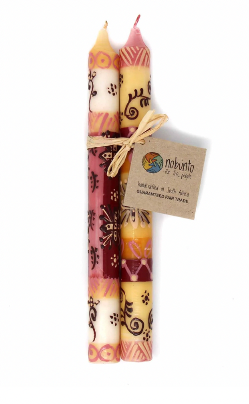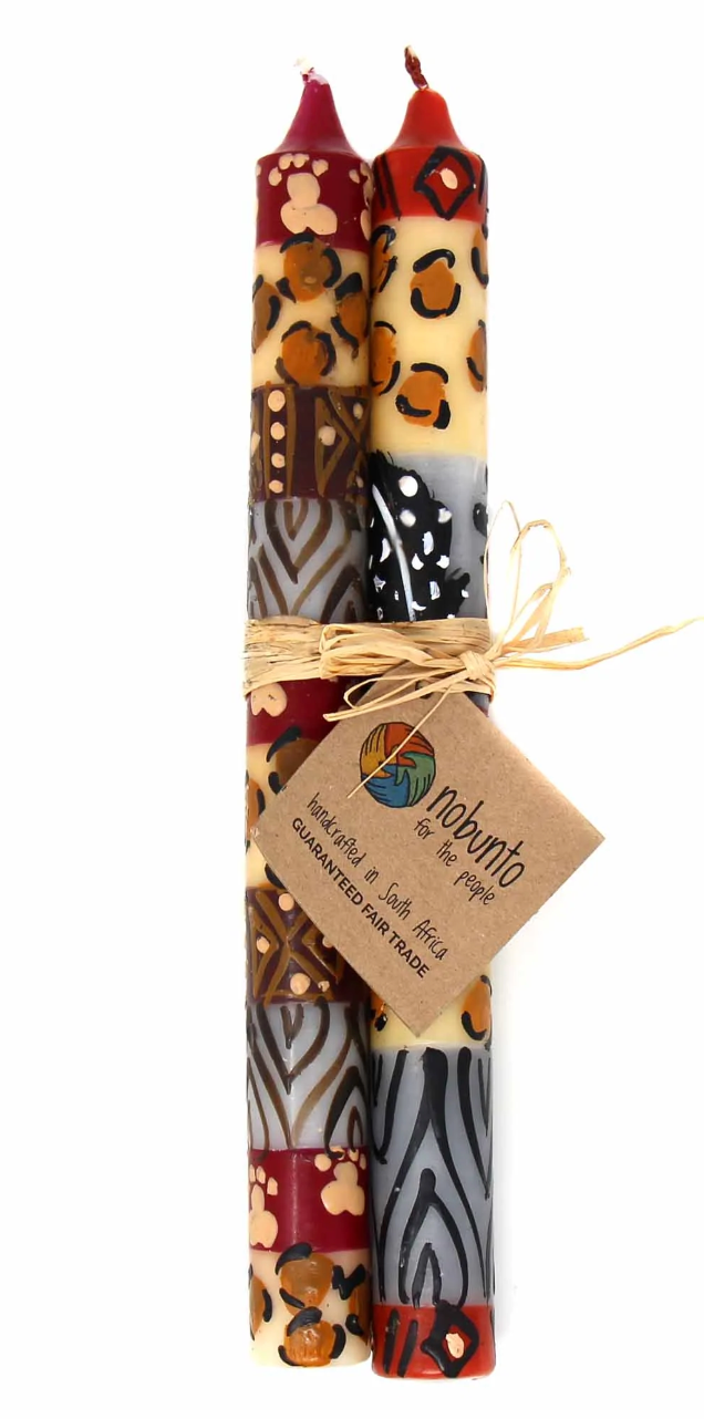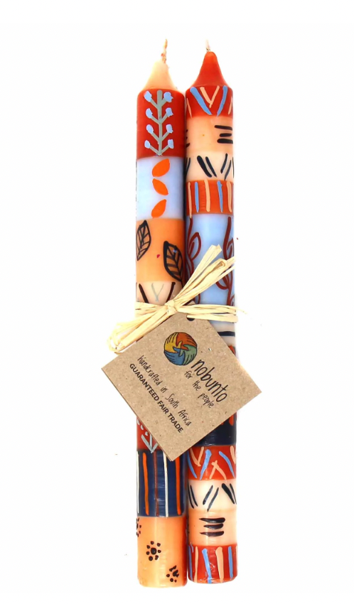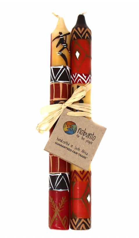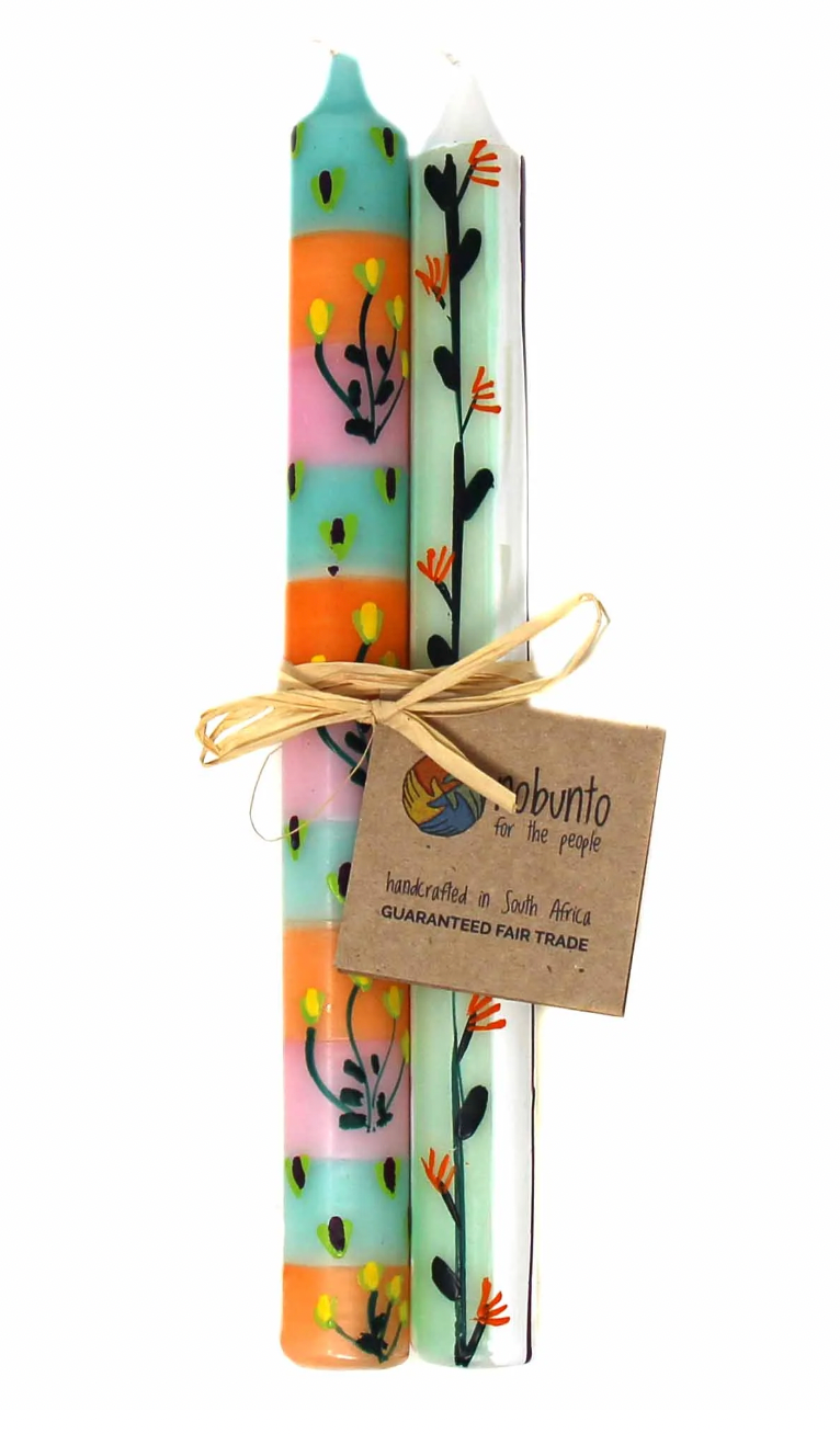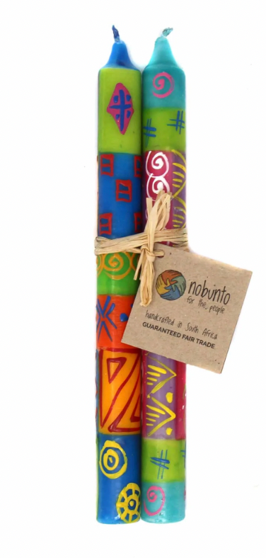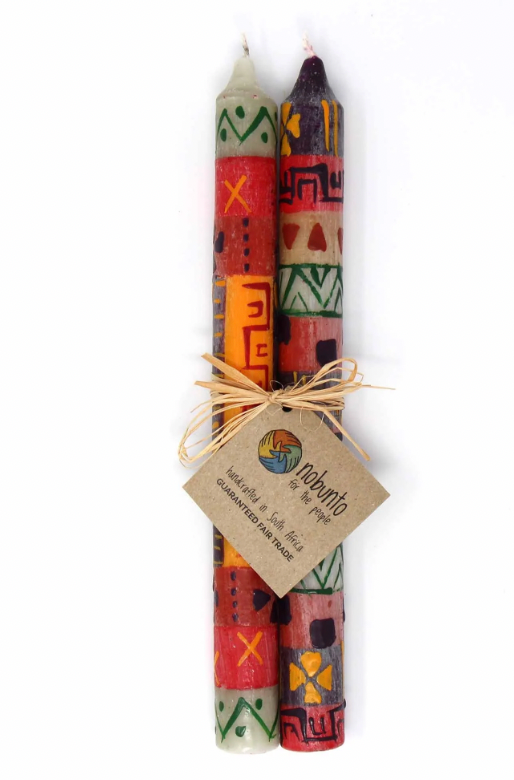 Each candle is hand poured and hand painted by South African artisans with years of experience. After the candles are poured, they are handed off to the special background painters, who paint the entire wax candle with a base color that sets the tone for the design work that comes next. Masterful artists then paint the designs on each piece. It is truly exciting to watch the lightening-fast strokes of the paintbrushes transform what was molten wax into gorgeously colorful, individualized works of art!